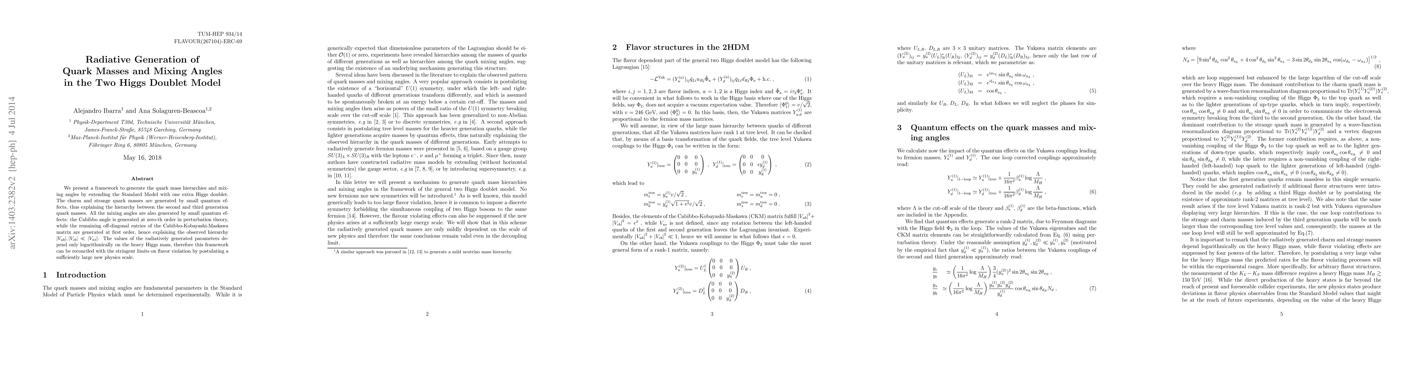 This paper proposes a framework in the Two Higgs Doublet Model to radiatively generate quark masses and mixing angles, explaining the mass hierarchy and mixing patterns through small quantum effects. The model reconciles with flavor-violating limits by assuming a high new physics scale.