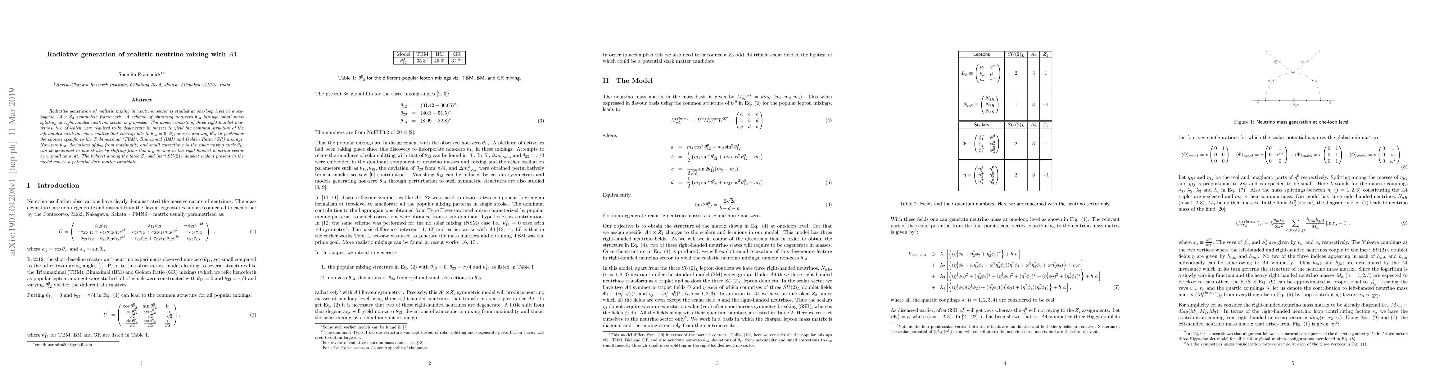 A new approach for radiative generation of realistic neutrino mixing was proposed using a scotogenic $A4 imes Z_2$ symmetric framework.