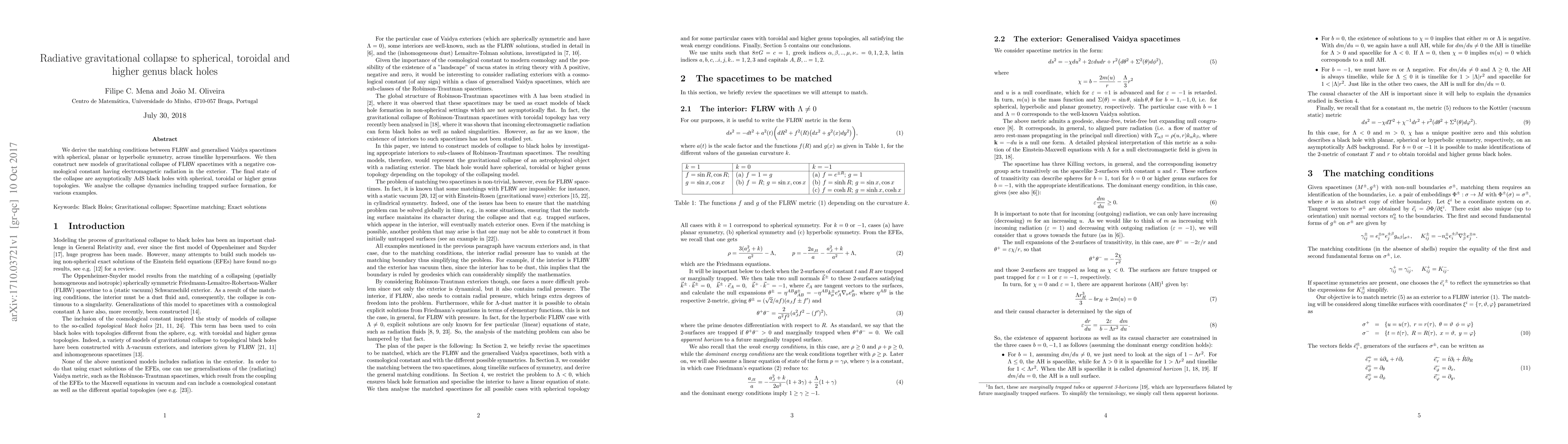 This paper derives matching conditions between FLRW and generalised Vaidya spacetimes to model gravitational collapse with electromagnetic radiation, resulting in asymptotically AdS black holes with spherical, toroidal, or higher genus topologies. The study analyzes the dynamics of trapped surface formation during the collapse process.