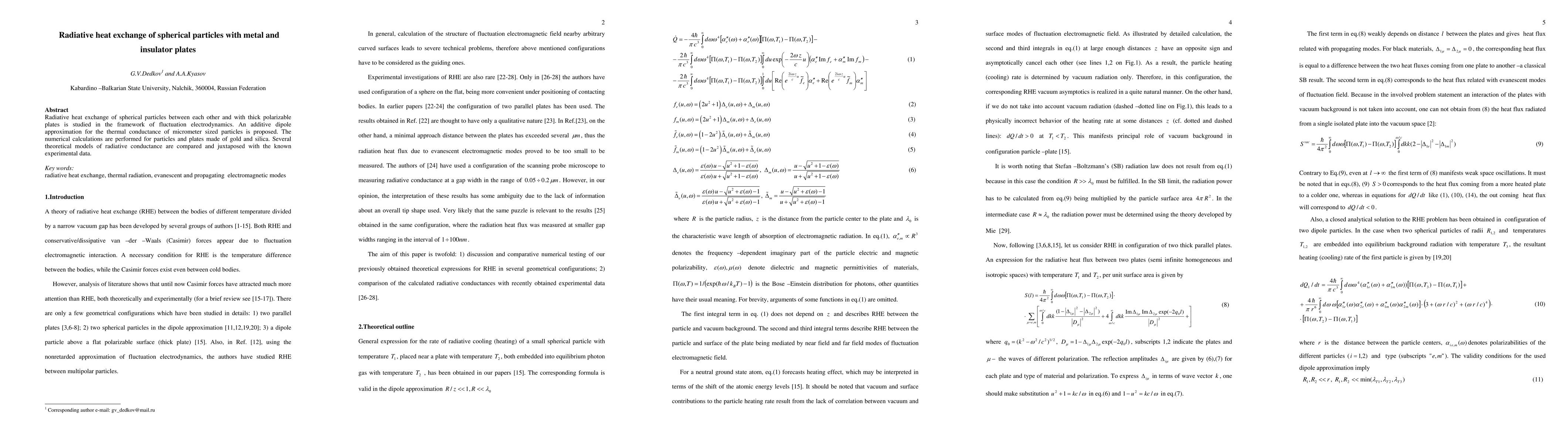 This paper investigates radiative heat exchange between spherical particles and metal/insulator plates using fluctuation electrodynamics, proposing a new additive dipole approximation for thermal conductance in micrometer-sized particles. Numerical results for gold and silica materials are compared with existing theoretical models and experimental data.