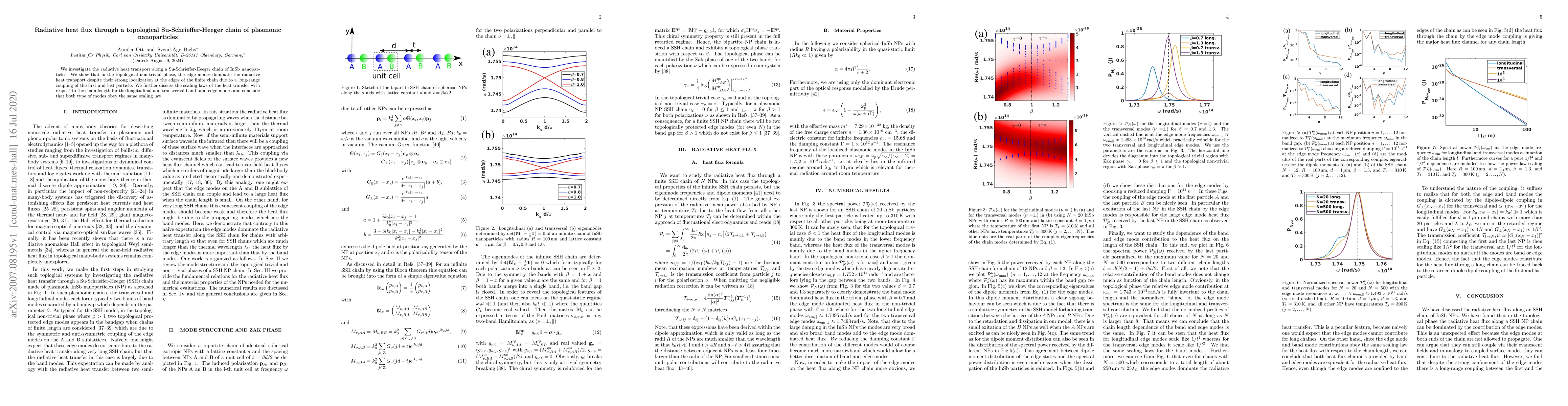 This paper examines radiative heat transport in a topological Su-Schrieffer-Heeger chain of InSb nanoparticles, demonstrating that edge modes dominate despite their strong localization, due to long-range coupling. It concludes that both longitudinal and transversal band and edge modes scale similarly with chain length.