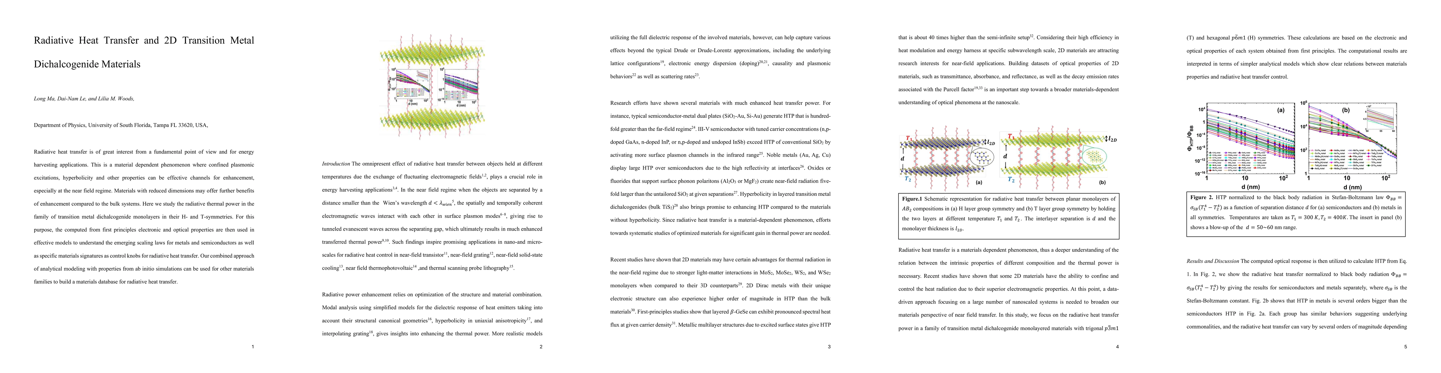 Radiative heat transfer is of great interest from a fundamental point of view and for energy harvesting applications. This is a material dependent phenomenon where confined plasmonic excitations, hyperbolicity and other properties can be effective channels for enhancement, especially at the near field regime. Materials with reduced dimensions may offer further benefits of enhancement compared to the bulk systems. Here we study the radiative thermal power in the family of transition metal dichalcogenide monolayers in their H- and T-symmetries. For this purpose, the computed from first principles electronic and optical properties are then used in effective models to understand the emerging scaling laws for metals and semiconductors as well as specific materials signatures as control knobs for radiative heat transfer. Our combined approach of analytical modeling with properties from ab initio simulations can be used for other materials families to build a materials database for radiative heat transfer.