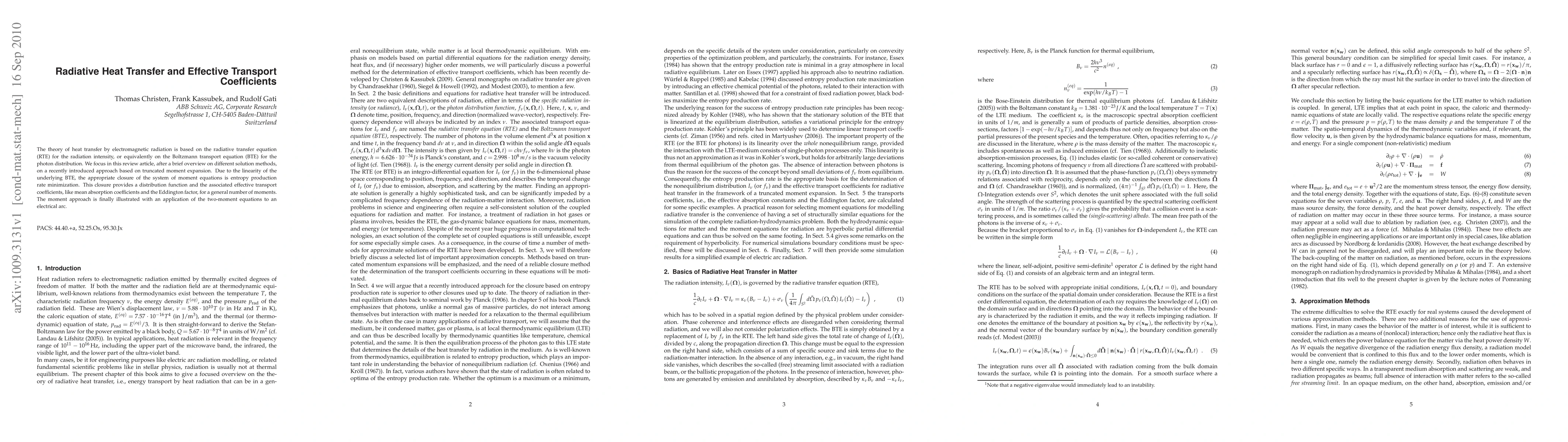 This paper reviews the theory of radiative heat transfer and introduces a truncated moment expansion approach based on the Boltzmann transport equation. It focuses on entropy production rate minimization to derive effective transport coefficients, illustrated by applying the two-moment equations to an electrical arc.