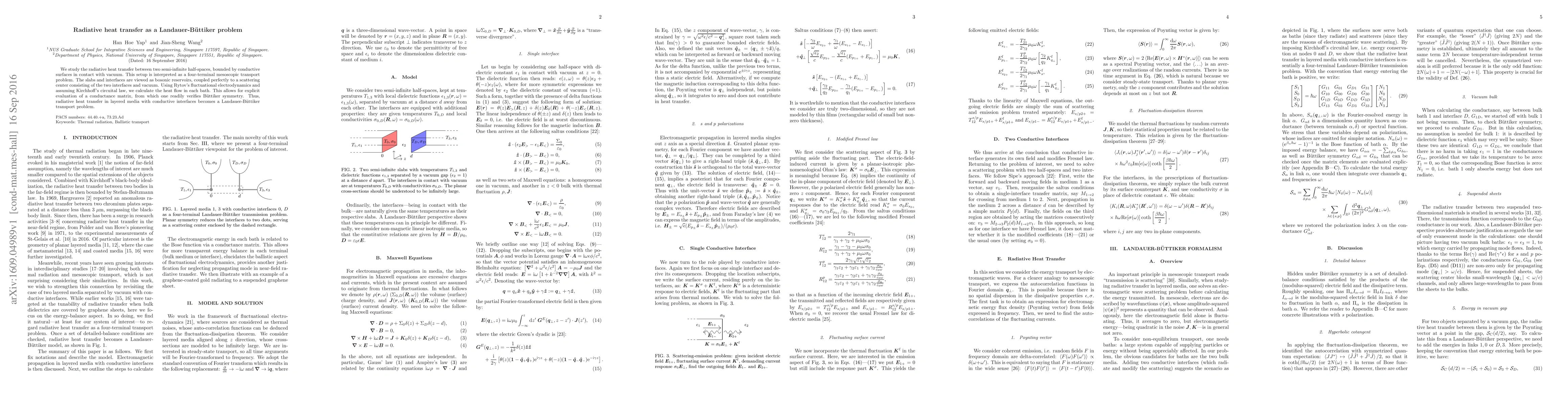 This paper interprets radiative heat transfer between conductive surfaces in vacuum as a mesoscopic transport problem, employing Rytov's fluctuational electrodynamics to calculate heat flow and derive a conductance matrix that exhibits Büttiker symmetry, thus framing it as a Landauer-Büttiker transport issue.