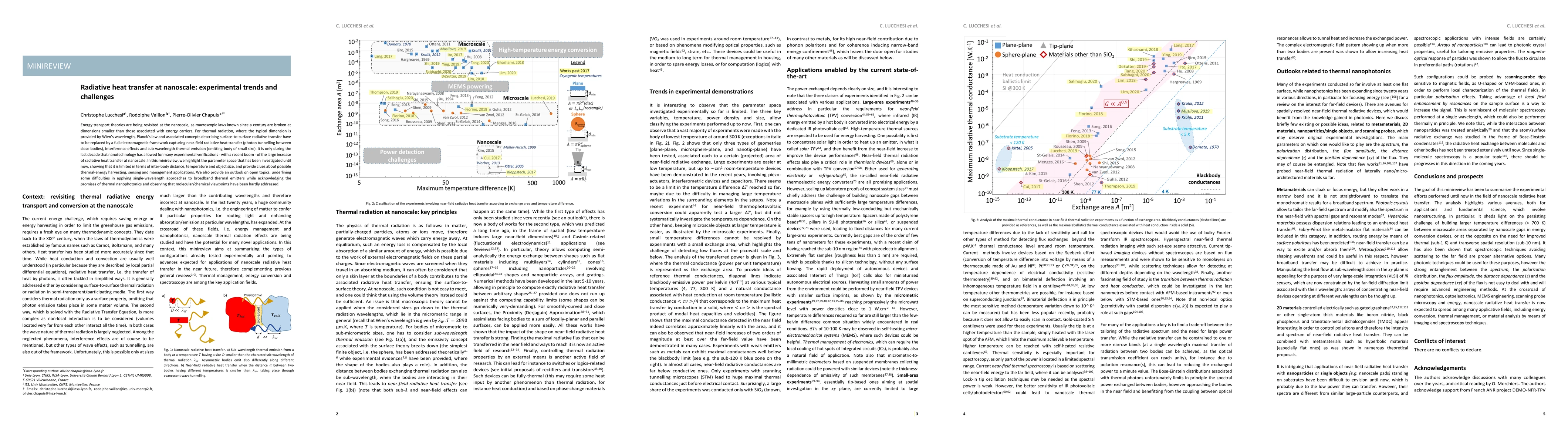 Energy transport theories are being revisited at the nanoscale, as macroscopic laws known since a century are broken at dimensions smaller than those associated with energy carriers. For thermal radiation, where the typical dimension is provided by Wien's wavelength, Planck's law and associated concepts describing surface-to-surface radiative transfer have to be replaced by a full electromagnetic framework capturing near-field radiative heat transfer (photon tunnelling between close bodies), interference effects and sub-wavelength thermal emission (emitting body of small size). It is only during the last decade that nanotechnology has allowed for many experimental verifications-with a recent boom-of the large increase of radiative heat transfer at nanoscale. In this minireview, we highlight the parameter space that has been investigated until now, showing that it is limited in terms of inter-body distance, temperature and object size, and provide clues about possible thermal-energy harvesting, sensing and management applications. We also provide an outlook on open topics, underlining some difficulties in applying single-wavelength approaches to broadband thermal emitters while acknowledging the promises of thermal nanophotonics and observing that molecular/chemical viewpoints have been hardly addressed. Context: revisiting thermal radiative energy transport and conversion at the nanoscale