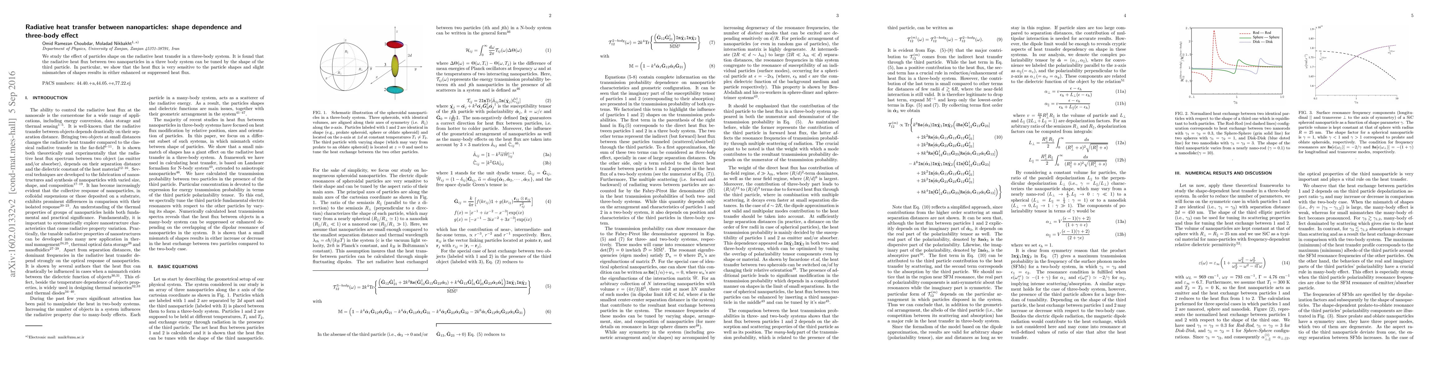 This paper investigates how the shape of nanoparticles influences radiative heat transfer in a three-body system, revealing that the presence of a third particle can significantly alter the heat flux between two others. The study finds that small shape discrepancies can either enhance or suppress the radiative heat transfer.
