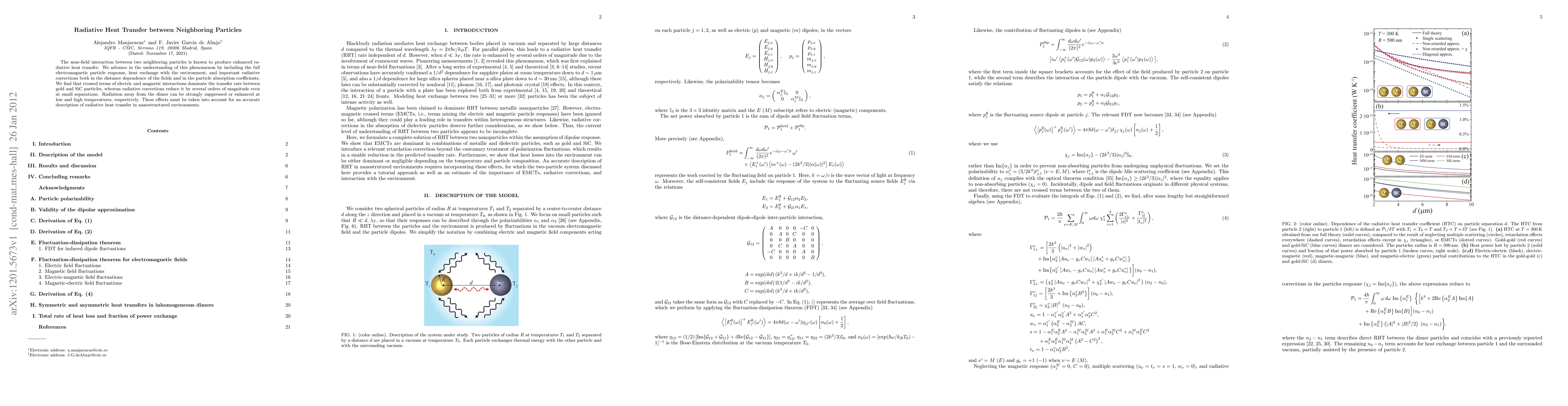 The near-field interaction between two neighboring particles is known to produce enhanced radiative heat transfer. We advance in the understanding of this phenomenon by including the full electromagnetic particle response, heat exchange with the environment, and important radiative corrections both in the distance dependence of the fields and in the particle absorption coefficients. We find that crossed terms of electric and magnetic interactions dominate the transfer rate between gold and SiC particles, whereas radiative corrections reduce it by several orders of magnitude even at small separations. Radiation away from the dimer can be strongly suppressed or enhanced at low and high temperatures, respectively. These effects must be taken into account for an accurate description of radiative heat transfer in nanostructured environments.
