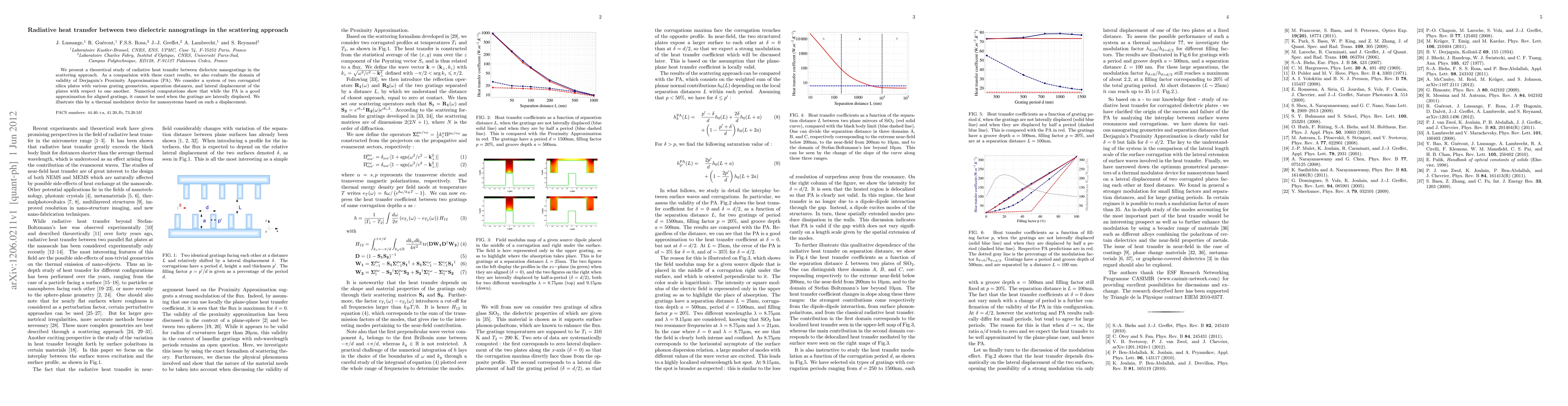 We present a theoretical study of radiative heat transfer between dielectric nanogratings in the scattering approach. As a comparision with these exact results, we also evaluate the domain of validity of Derjaguin's Proximity Approximation (PA). We consider a system of two corrugated silica plates with various grating geometries, separation distances, and lateral displacement of the plates with respect to one another. Numerical computations show that while the PA is a good approximation for aligned gratings, it cannot be used when the gratings are laterally displaced. We illustrate this by a thermal modulator device for nanosystems based on such a displacement.
