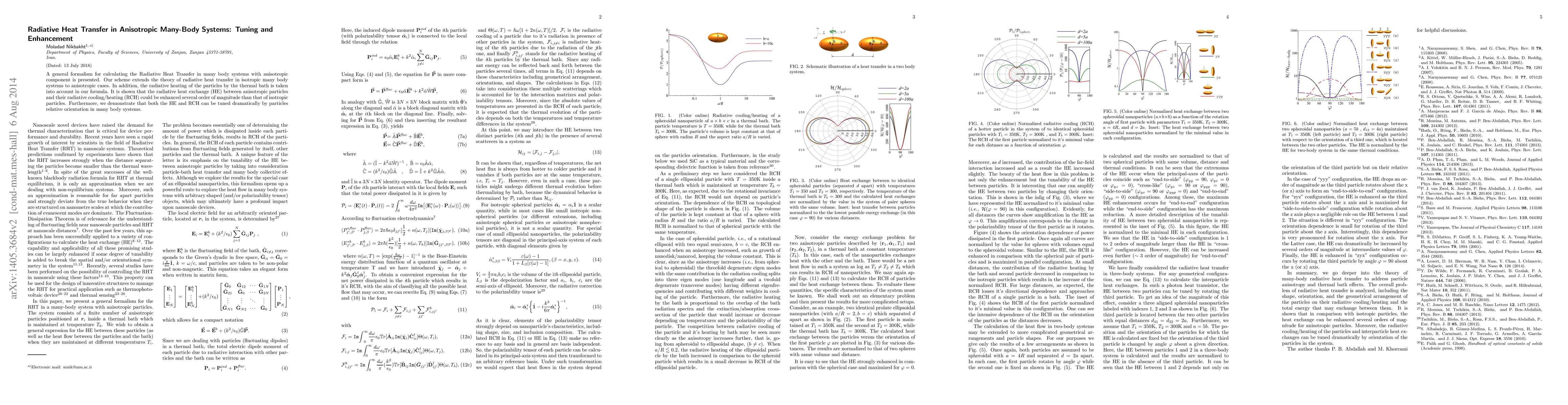 This paper presents a formalism for calculating radiative heat transfer in anisotropic many-body systems, extending existing theories for isotropic systems. It shows that radiative heat exchange and cooling/heating in anisotropic particles can be significantly enhanced compared to isotropic particles, with both processes tunable by particle orientation.