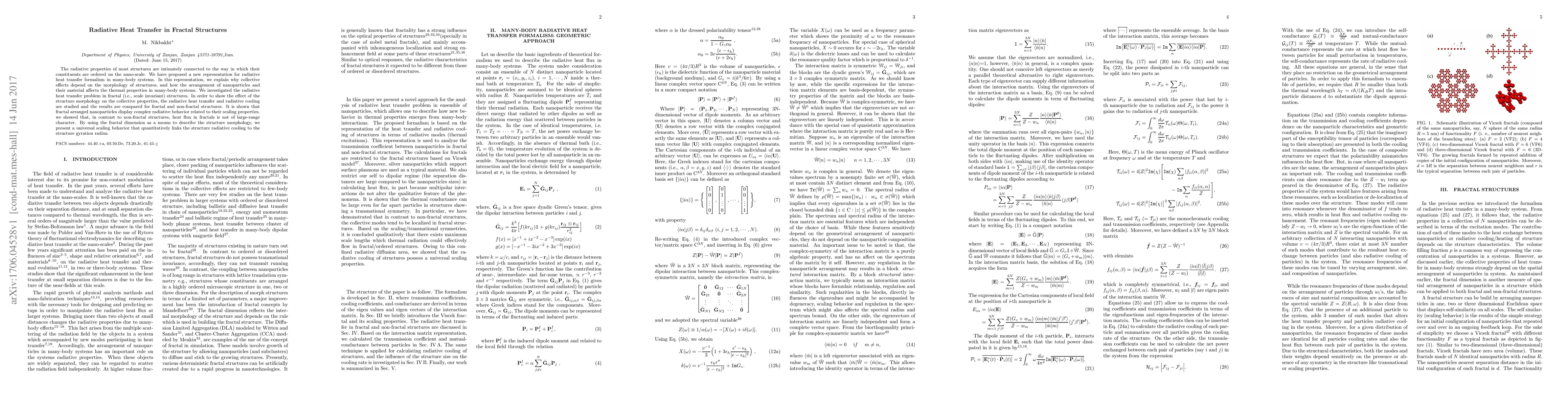 This paper proposes a new formalism for radiative heat transfer in many-body systems, emphasizing how fractal structures' morphology affects thermal properties. It demonstrates that fractal nanoparticles exhibit unique radiative behavior due to their scaling properties, unlike non-fractal structures, and introduces a universal scaling relation linking structure morphology to radiative cooling.