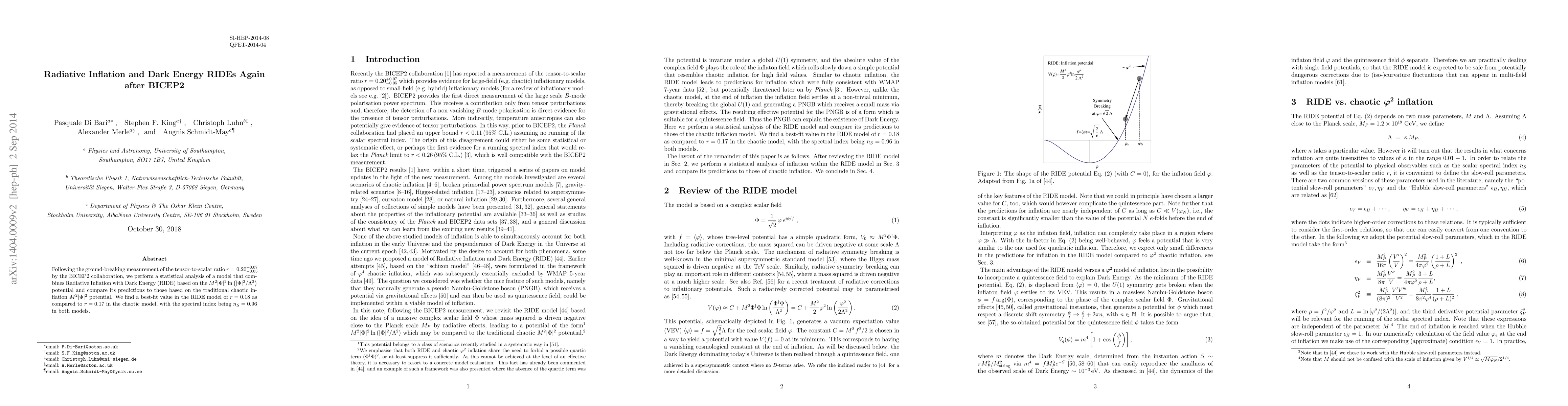 Following the ground-breaking measurement of the tensor-to-scalar ratio $r = 0.20^{+0.07}_{- 0.05}$ by the BICEP2 collaboration, we perform a statistical analysis of a model that combines Radiative Inflation with Dark Energy (RIDE) based on the $M^2 |\Phi|^2 \ln \left(|\Phi|^2/\Lambda^2 \right)$ potential and compare its predictions to those based on the traditional chaotic inflation $M^2|\Phi|^2$ potential. We find a best-fit value in the RIDE model of $r=0.18$ as compared to $r=0.17$ in the chaotic model, with the spectral index being $n_S=0.96$ in both models.