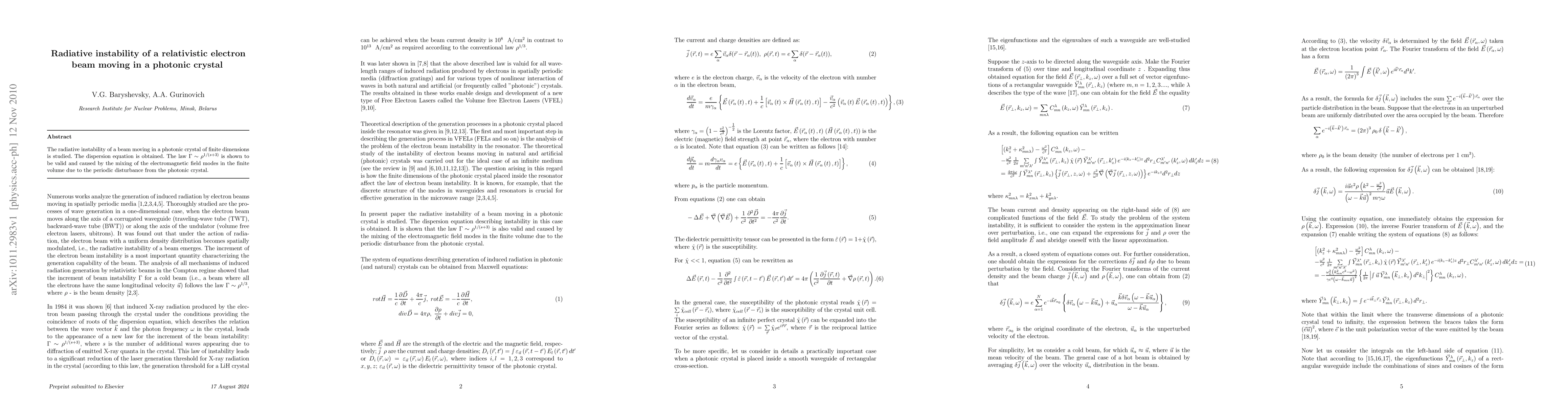 Summary: This paper investigates the radiative instability of a relativistic electron beam in a finite-dimensional photonic crystal, deriving a dispersion equation and demonstrating that the instability follows the law $\Gamma\sim\rho^{1/(s+3)}$ due to electromagnetic field mode mixing caused by the crystal's periodic structure.