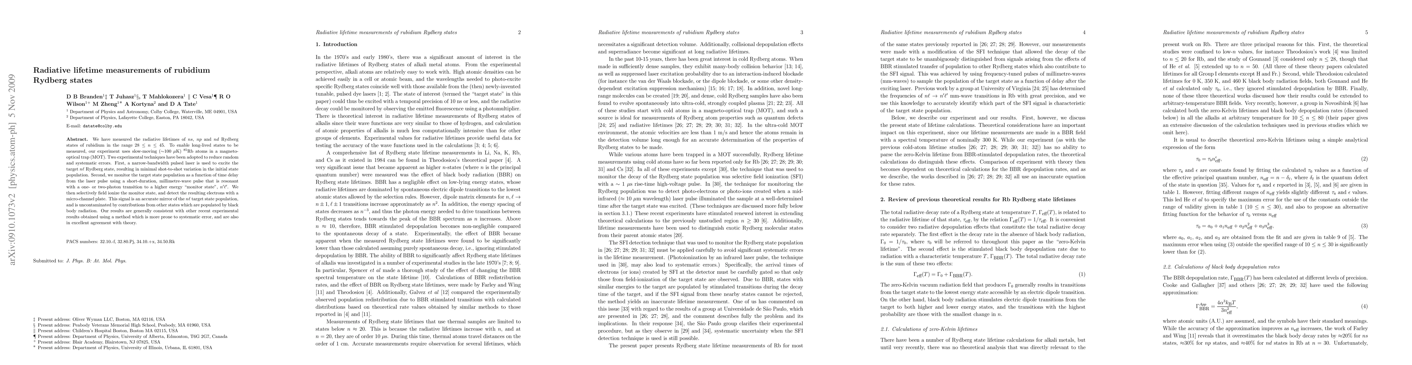 This study measures the radiative lifetimes of rubidium Rydberg states (ns, np, and nd) for principal quantum numbers 28 < n < 45 using slow-moving atoms in a magneto-optical trap. The experiment employs precise laser excitation and millimetre-wave monitoring to yield accurate decay measurements, showing consistency with theory and previous results.