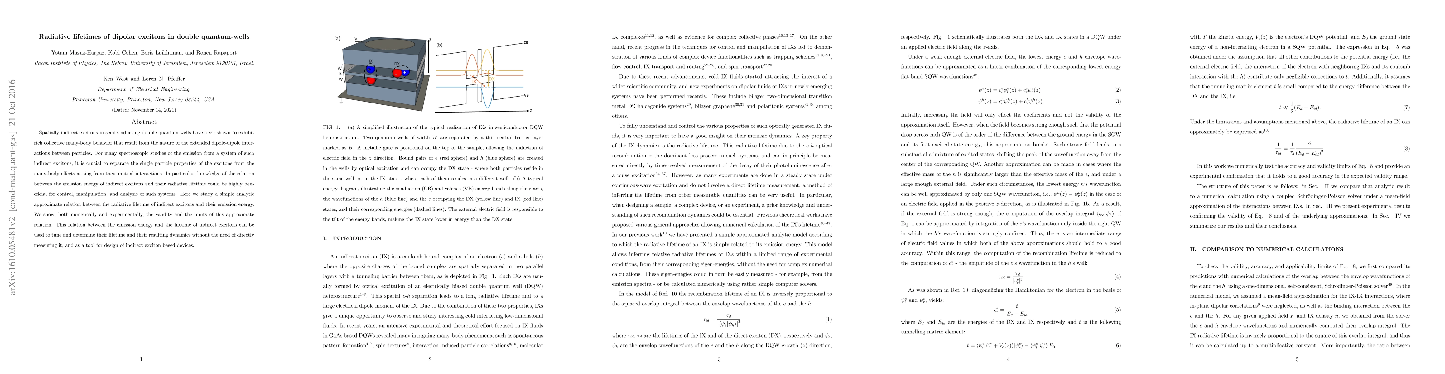 This paper explores the relationship between the radiative lifetime and emission energy of dipolar excitons in semiconducting double quantum wells, providing an analytical approximation that validates this relation both numerically and experimentally. This insight enables tuning and analysis of exciton dynamics without direct lifetime measurement, facilitating the design of related devices.