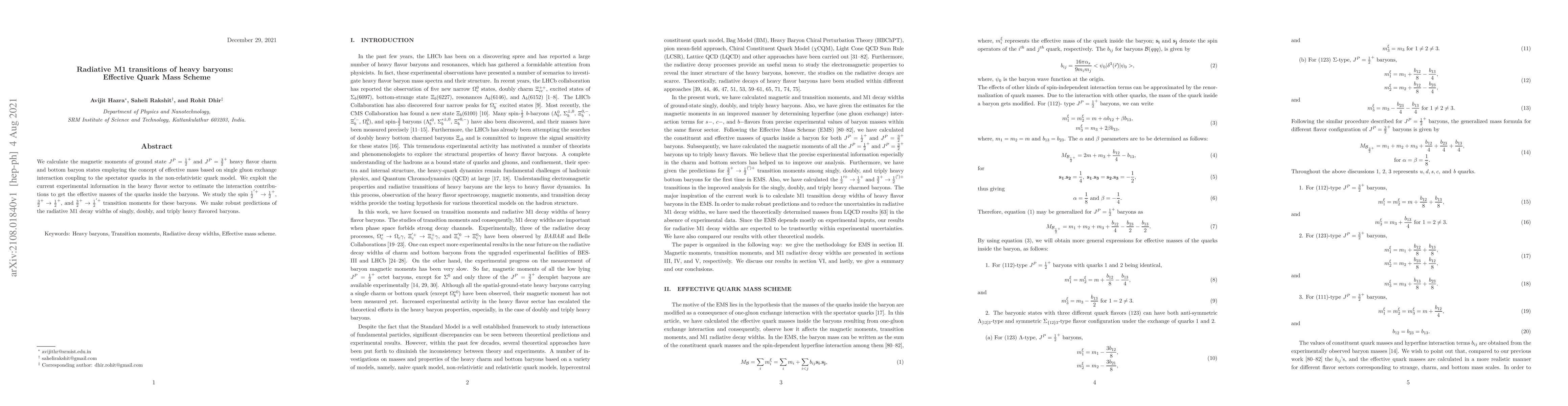 This paper calculates magnetic moments and radiative M1 transition moments for charm and bottom baryons using an effective quark mass scheme based on single gluon exchange. Predictions for the radiative M1 decay widths of various heavy baryons are provided.