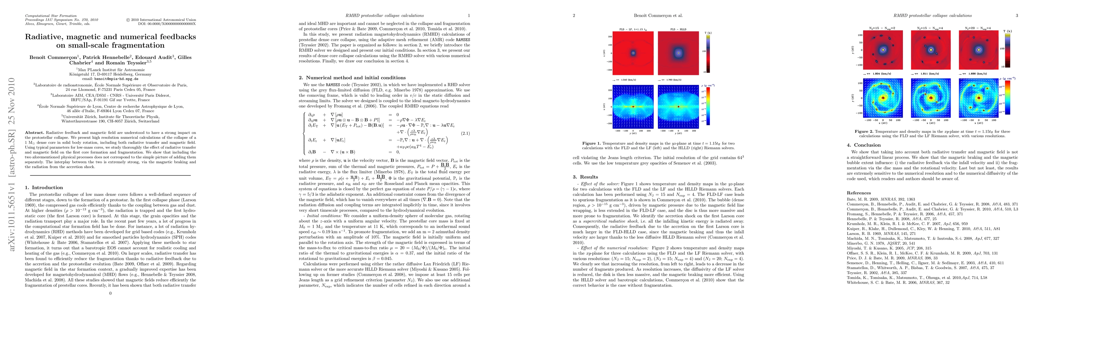 Radiative feedback and magnetic field are understood to have a strong impact on the protostellar collapse. We present high resolution numerical calculations of the collapse of a 1 solar mass dense core in solid body rotation, including both radiative transfer and magnetic field. Using typical parameters for low-mass cores, we study thoroughly the effect of radiative transfer and magnetic field on the first core formation and fragmentation. We show that including the two aforementioned physical processes does not correspond to the simple picture of adding them separately. The interplay between the two is extremely strong, via the magnetic braking and the radiation from the accretion shock.