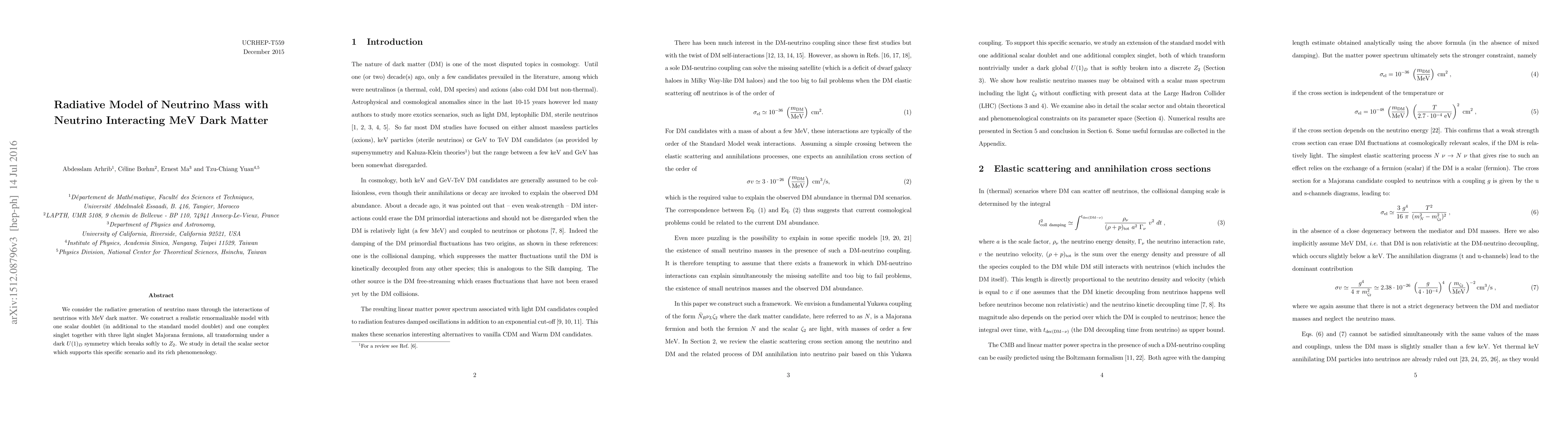 We consider the radiative generation of neutrino mass through the interactions of neutrinos with MeV dark matter. We construct a realistic renormalizable model with one scalar doublet and one complex singlet together with three light singlet Majorana fermions, all transforming under a dark U(1) symmetry which breaks softly to Z_2. We study in detail the scalar sector which supports this specific scenario and its rich phenomenology.