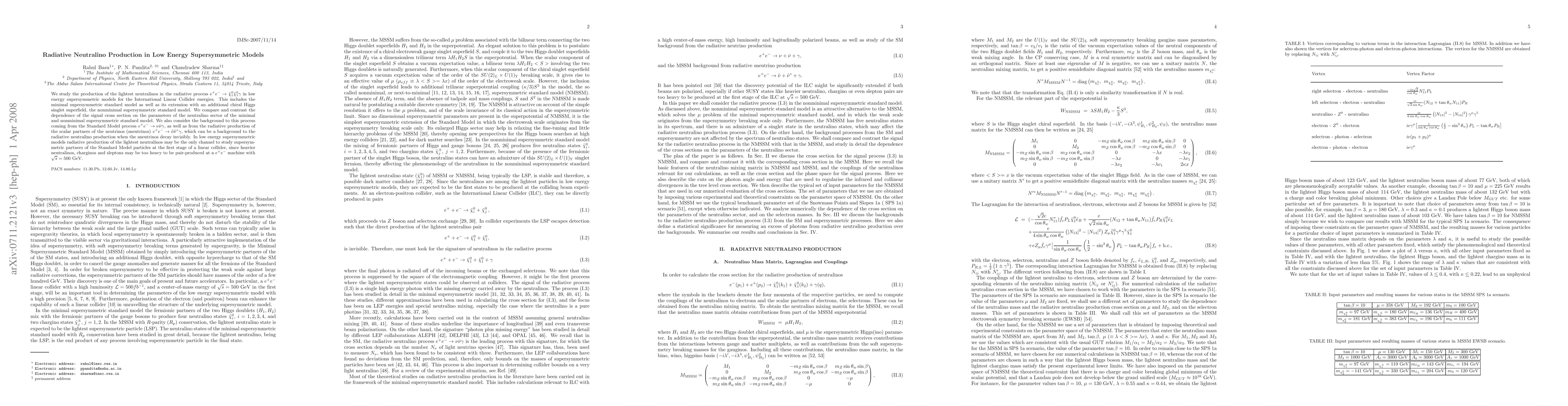 This paper investigates the radiative production of the lightest neutralinos in low energy supersymmetric models at International Linear Collider energies, comparing minimal and nonminimal supersymmetric standard models. It also examines backgrounds from Standard Model processes and invisibly decaying sneutrinos.
