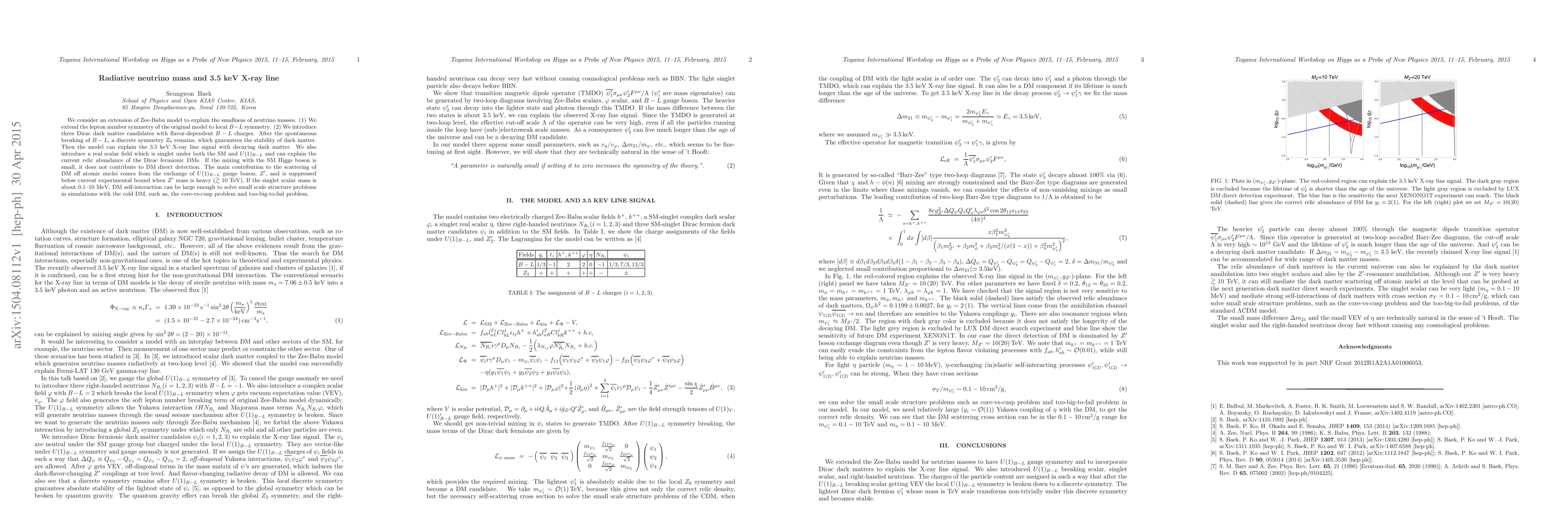 A theoretical model proposes that a 3.5 keV X-ray line signal can explain small neutrino masses, while also providing a solution to the small-scale structure problems with dark matter, by introducing a new gauge boson and scalar field within the framework of local B-L symmetry.