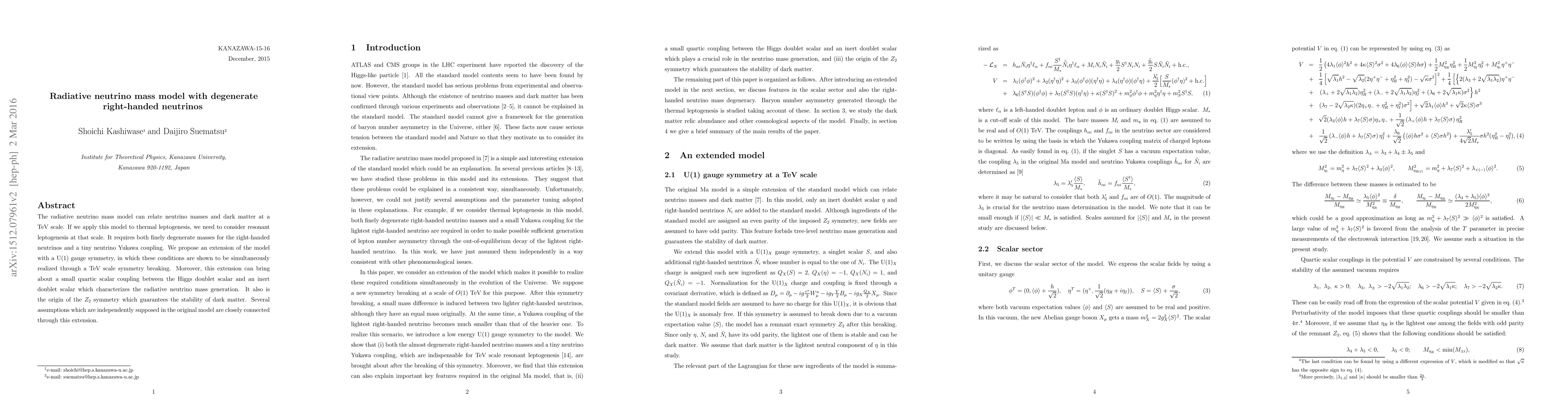 This paper proposes an extended radiative neutrino mass model with a U(1) gauge symmetry, achieving finely degenerate right-handed neutrino masses and a tiny Yukawa coupling through TeV scale symmetry breaking. This model also introduces a small quartic scalar coupling and a $Z_2$ symmetry ensuring dark matter stability.