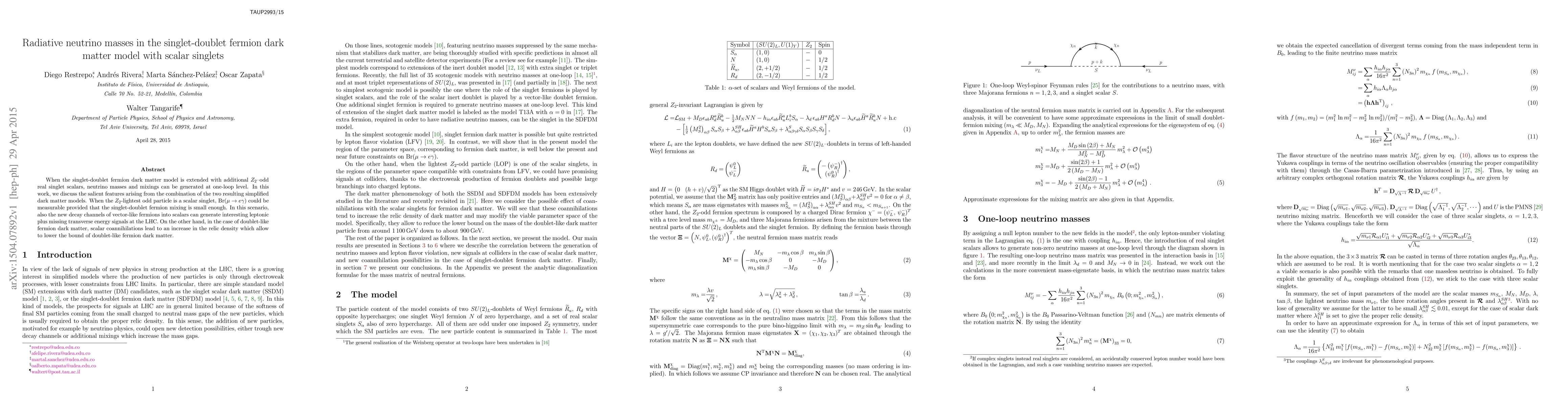 When the singlet-doublet fermion dark matter model is extended with additional $Z_2$--odd real singlet scalars, neutrino masses and mixings can be generated at one-loop level. In this work, we discuss the salient features arising from the combination of the two resulting simplified dark matter models. When the $Z_2$-lightest odd particle is a scalar singlet, $\operatorname{Br}(\mu\to e \gamma)$ could be measurable provided that the singlet-doublet fermion mixing is small enough. In this scenario, also the new decay channels of vector-like fermions into scalars can generate interesting leptonic plus missing transverse energy signals at the LHC. On the other hand, in the case of doublet-like fermion dark matter, scalar coannihilations lead to an increase in the relic density which allow to lower the bound of doublet-like fermion dark matter.