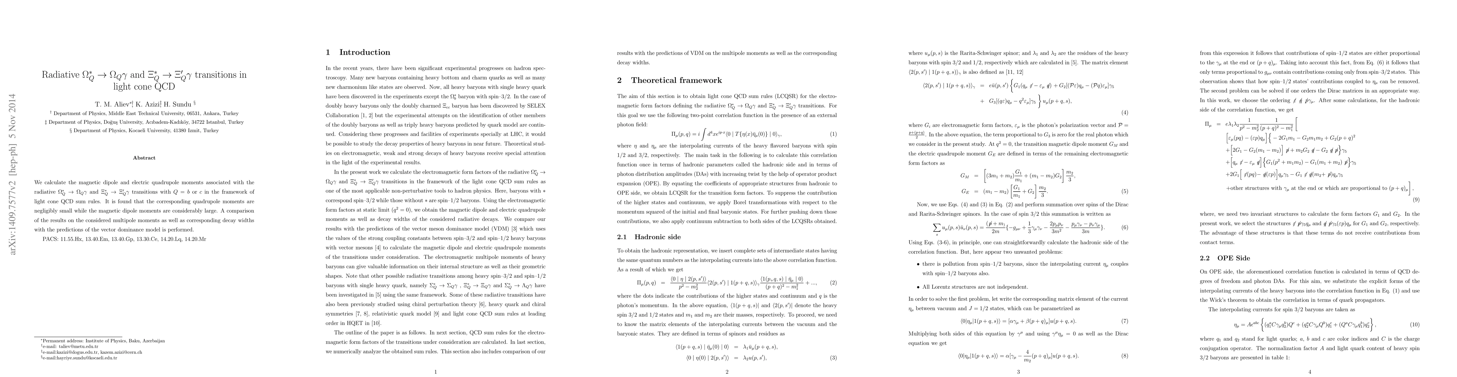 This paper calculates magnetic dipole and electric quadrupole moments for the radiative transitions $\Omega_{Q}^{*}\rightarrow\Omega_{Q}\gamma$ and $\Xi_{Q}^{*}\rightarrow\Xi^{\prime}_{Q}\gamma$ using light cone QCD sum rules, finding large magnetic dipole moments but negligible quadrupole moments. It also compares these results with the vector dominance model predictions.