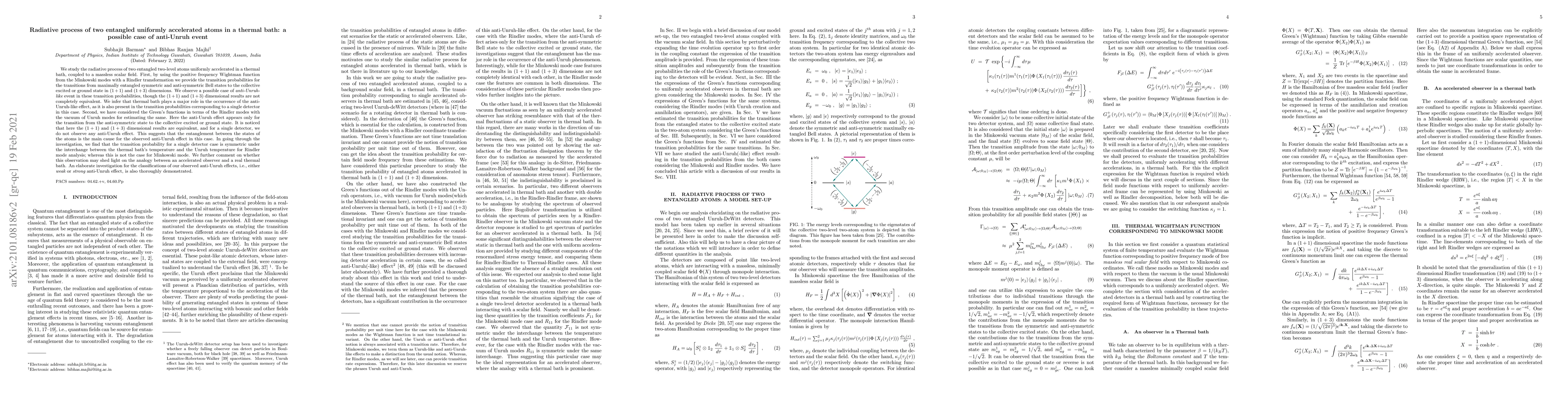 This paper investigates the radiative process of two entangled uniformly accelerated atoms in a thermal bath, revealing a possible anti-Unruh-like effect in transition probabilities. The study shows that the thermal bath significantly influences the occurrence of this effect, which is primarily due to the entanglement between the atoms' states.