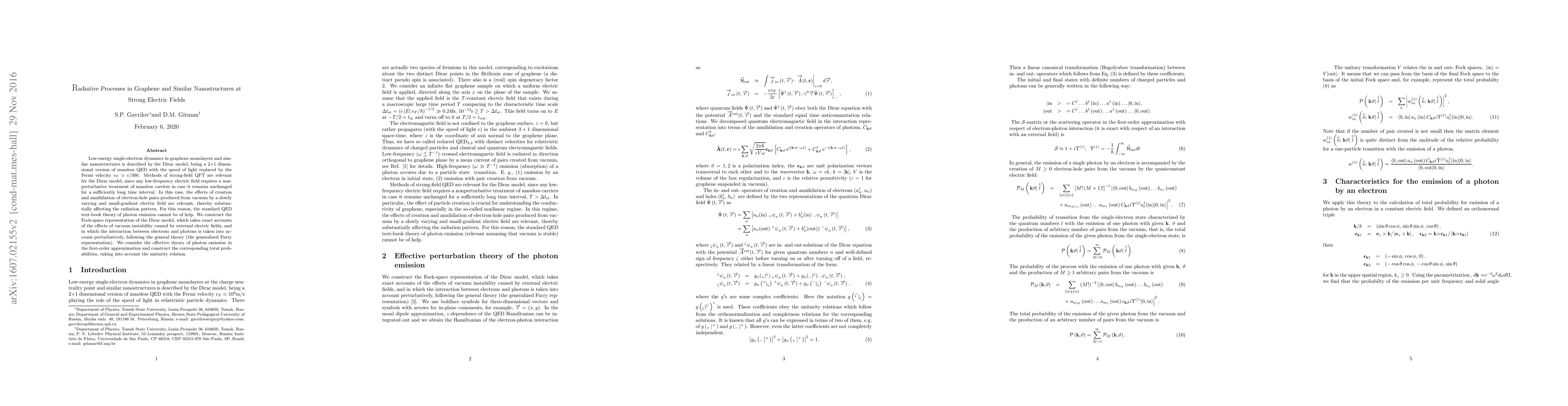 Low-energy single-electron dynamics in graphene monolayers and similar nanostructures is described by the Dirac model, being a 2+1 dimensional version of massless QED with the speed of light replaced by the Fermi velocity v_{F}=c/300. Methods of strong-field QFT are relevant for the Dirac model, since any low-frequency electric field requires a nonperturbative treatment of massless carriers in case it remains unchanged for a sufficiently long time interval. In this case, the effects of creation and annihilation of electron-hole pairs produced from vacuum by a slowly varying and small-gradient electric field are relevant, thereby substantially affecting the radiation pattern. For this reason, the standard QED text-book theory of photon emission cannot be of help. We construct the Fock-space representation of the Dirac model, which takes exact accounts of the effects of vacuum instability caused by external electric fields, and in which the interaction between electrons and photons is taken into account perturbatively, following the general theory (the generalized Furry representation). We consider the effective theory of photon emission in the first-order approximation and construct the corresponding total probabilities, taking into account the unitarity relation.