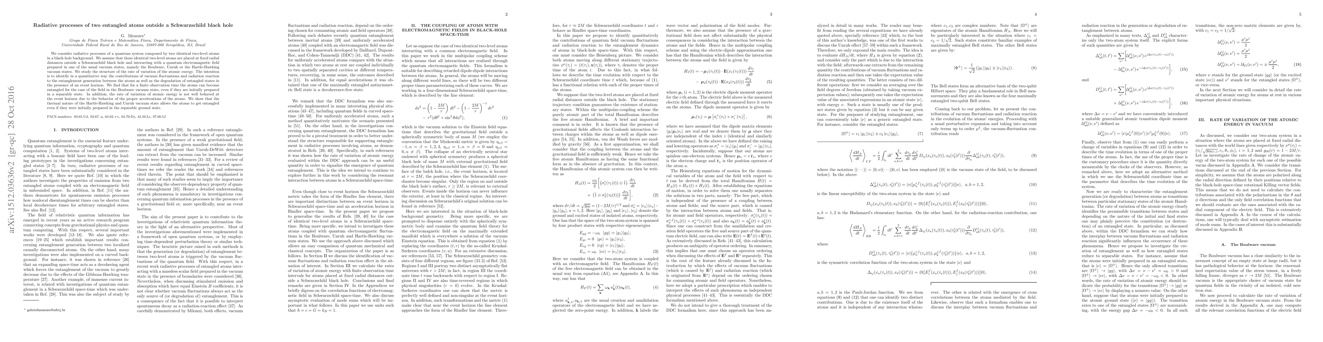 This paper investigates radiative processes of two entangled atoms outside a Schwarzschild black hole, focusing on their interaction with quantum electromagnetic fields in different vacuum states. It finds that entanglement can occur for atoms in the Boulware vacuum state, and the thermal nature of the Hartle-Hawking and Unruh states facilitates entanglement even from separable ground states, while the event horizon affects the rate of atomic energy variation.