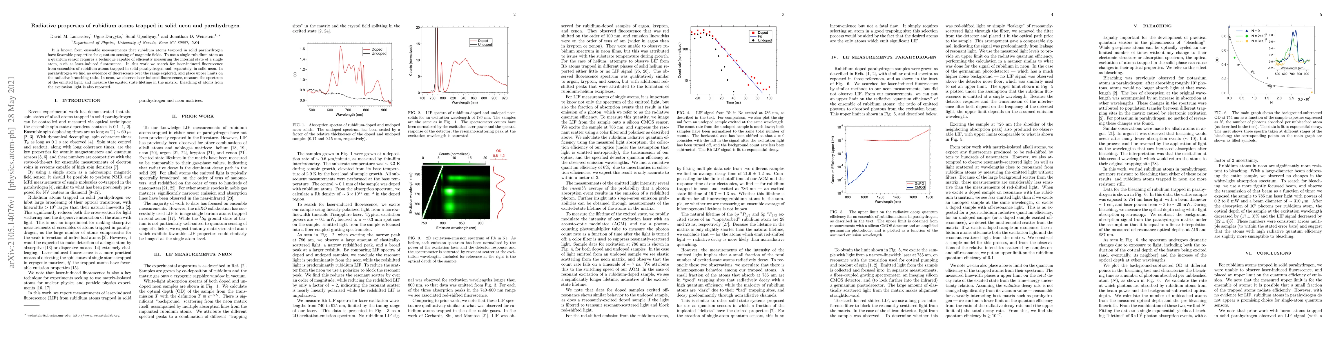 This paper investigates the radiative properties of rubidium atoms trapped in solid neon and parahydrogen for quantum sensing applications. While no laser-induced fluorescence is observed in rubidium atoms in solid parahydrogen, fluorescence is detected in solid neon, allowing for spectrum and lifetime measurements.