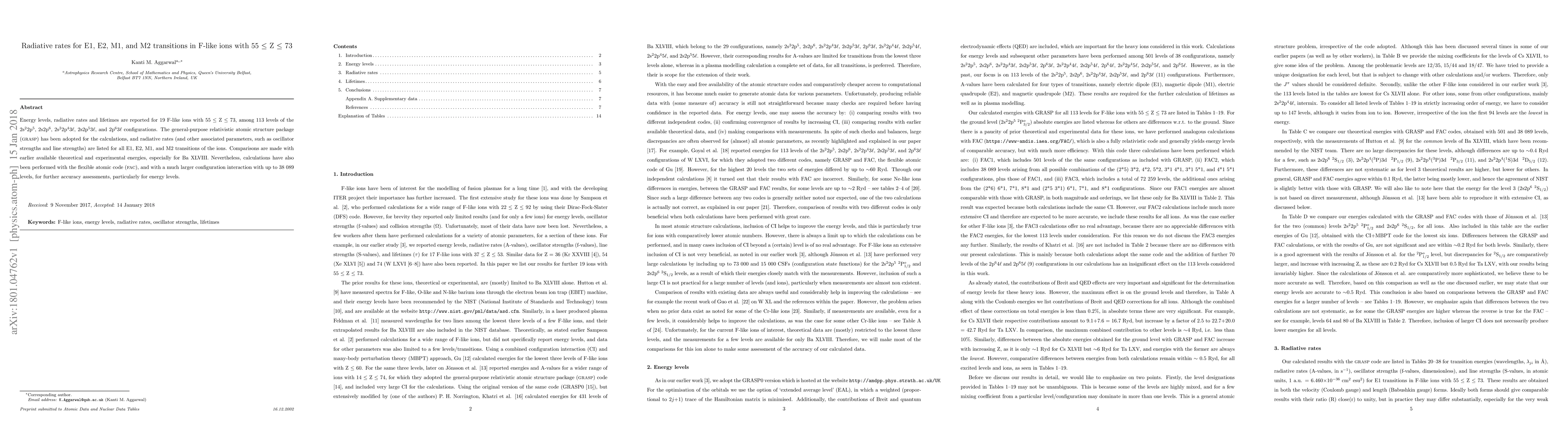 This paper reports radiative rates and lifetimes for 19 F-like ions (55 ≤ Z ≤ 73) using the GRASP package, detailing E1, E2, M1, and M2 transitions among various configurations. Comparisons with previous theoretical and experimental data are provided, and additional calculations using FAC and larger configuration interactions were performed for accuracy.