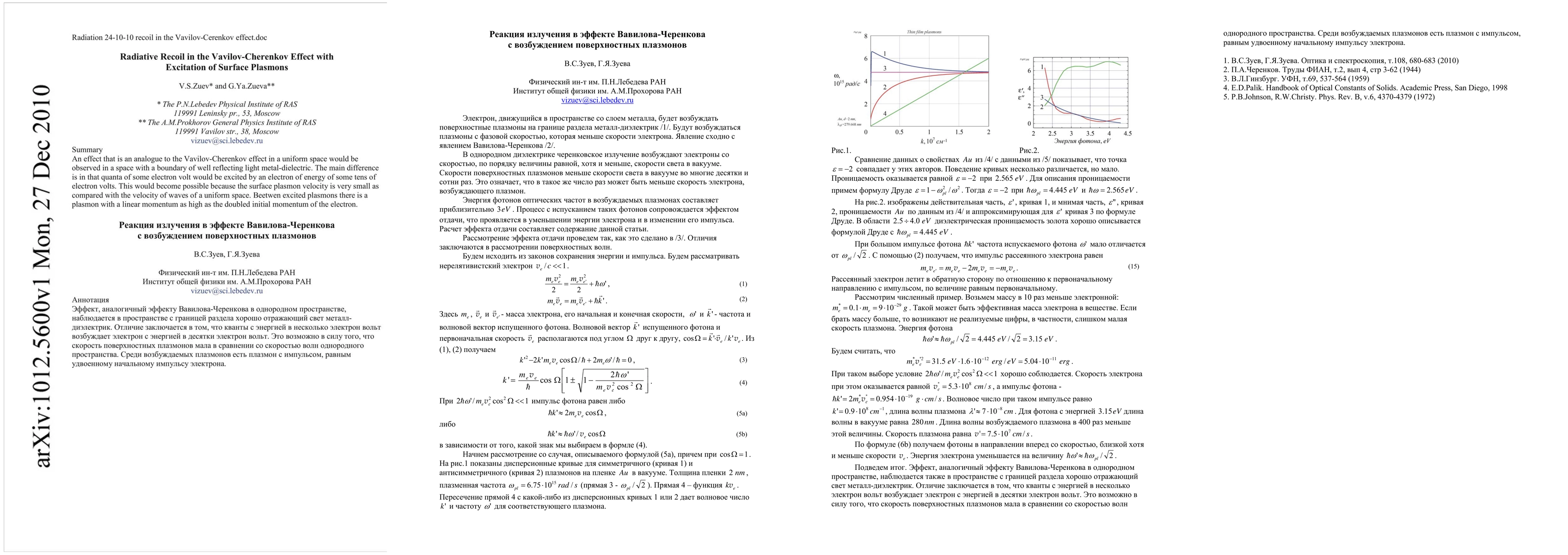 Summary: This paper explores an analogue of the Vavilov-Cherenkov effect in a boundary between a reflective metal and a dielectric, where surface plasmons are excited by high-energy electrons, resulting in radiative recoil and the emission of quanta due to the slower surface plasmon velocity. The effect involves the creation of a plasmon with momentum twice that of the initial electron.