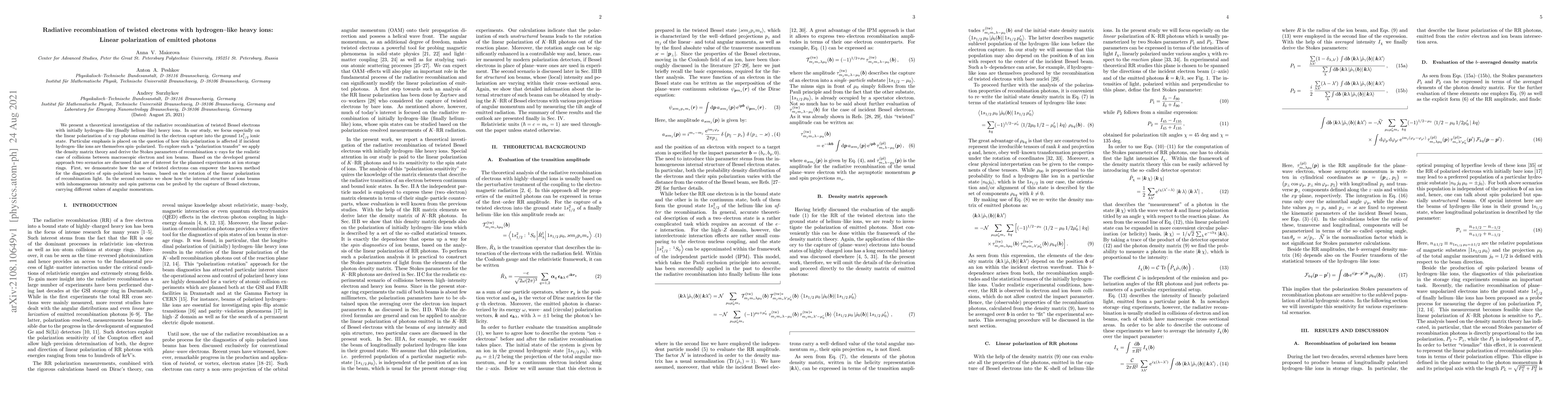 This paper investigates the radiative recombination of twisted Bessel electrons with hydrogen-like heavy ions, focusing on the linear polarization of emitted x-ray photons. It explores the polarization transfer from spin-polarized ions to recombination x-rays, using density matrix theory and discussing applications for diagnostics of spin-polarized ion beams and probing ion beam structures.