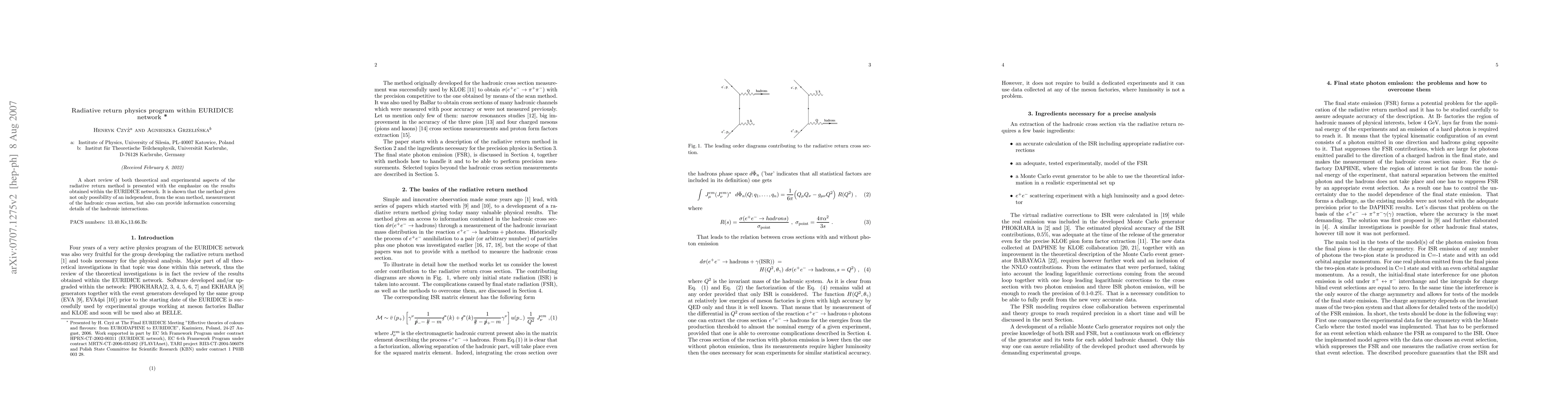 Summary: The paper reviews the radiative return method within the EURIDICE network, highlighting its ability to independently measure hadronic cross sections and provide insights into hadronic interactions, offering a valuable tool for experimental physics.