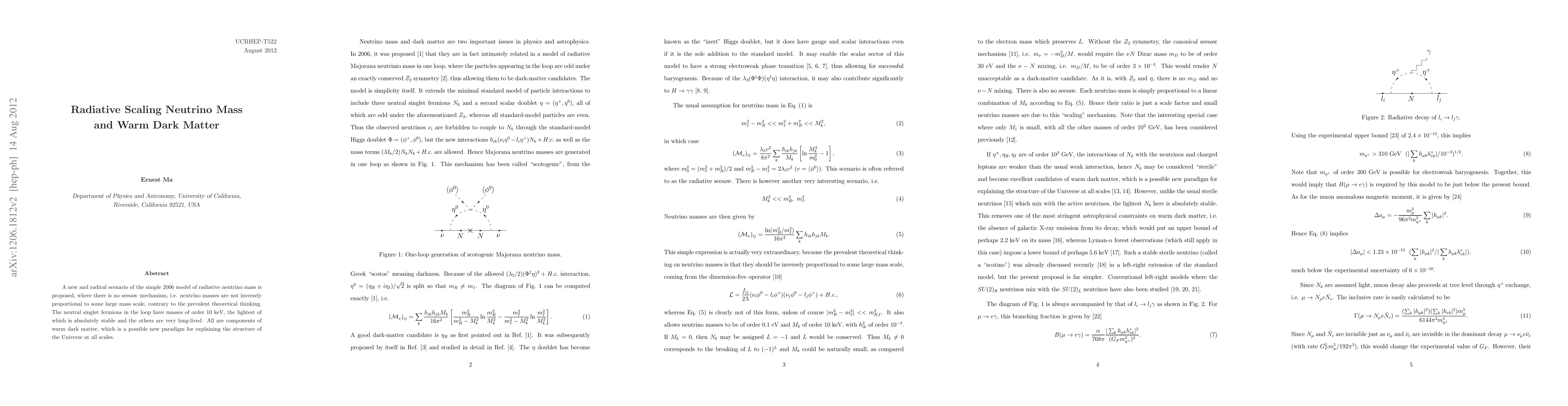 A new and radical scenario of the simple 2006 model of radiative neutrino mass is proposed, where there is no seesaw mechanism, i.e. neutrino masses are not inversely proportional to some large mass scale, contrary to the prevalent theoretical thinking. The neutral singlet fermions in the loop have masses of order 10 keV, the lightest of which is absolutely stable and the others are very long-lived. All are components of warm dark matter, which is a possible new paradigm for explaining the structure of the Universe at all scales.