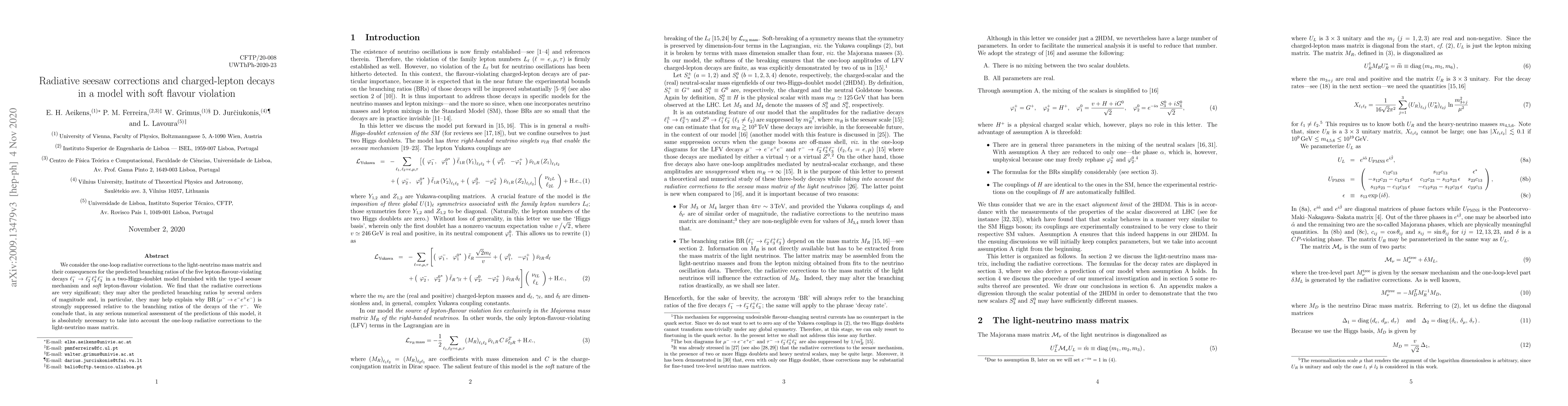 We consider the one-loop radiative corrections to the light-neutrino mass matrix and their consequences for the predicted branching ratios of the five lepton-flavour-violating decays $\ell_1^- \to \ell_2^- \ell_3^+ \ell_3^-$ in a two-Higgs-doublet model furnished with the type-I seesaw mechanism and soft lepton-flavour violation. We find that the radiative corrections are very significant; they may alter the predicted branching ratios by several orders of magnitude and, in particular, they may help explain why $\mbox{BR}(\mu^- \to e^- e^+ e^-)$ is strongly suppressed relative to the branching ratios of the decays of the $\tau^-$. We conclude that, in any serious numerical assessment of the predictions of this model, it is absolutely necessary to take into account the one-loop radiative corrections to the light-neutrino mass matrix.