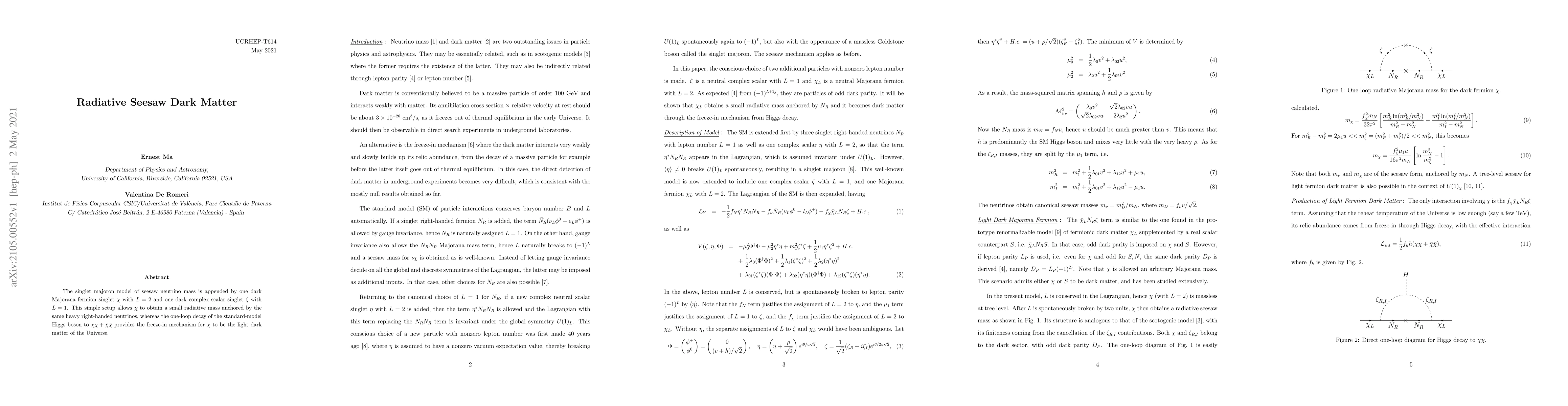 The singlet majoron model of seesaw neutrino mass is appended by one dark Majorana fermion singlet $\chi$ with $L=2$ and one dark complex scalar singlet $\zeta$ with $L=1$. This simple setup allows $\chi$ to obtain a small radiative mass anchored by the same heavy right-handed neutrinos, whereas the one-loop decay of the standard-model Higgs boson to $\chi \chi + \bar{\chi} \bar{\chi}$ provides the freeze-in mechanism for $\chi$ to be the light dark matter of the Universe.