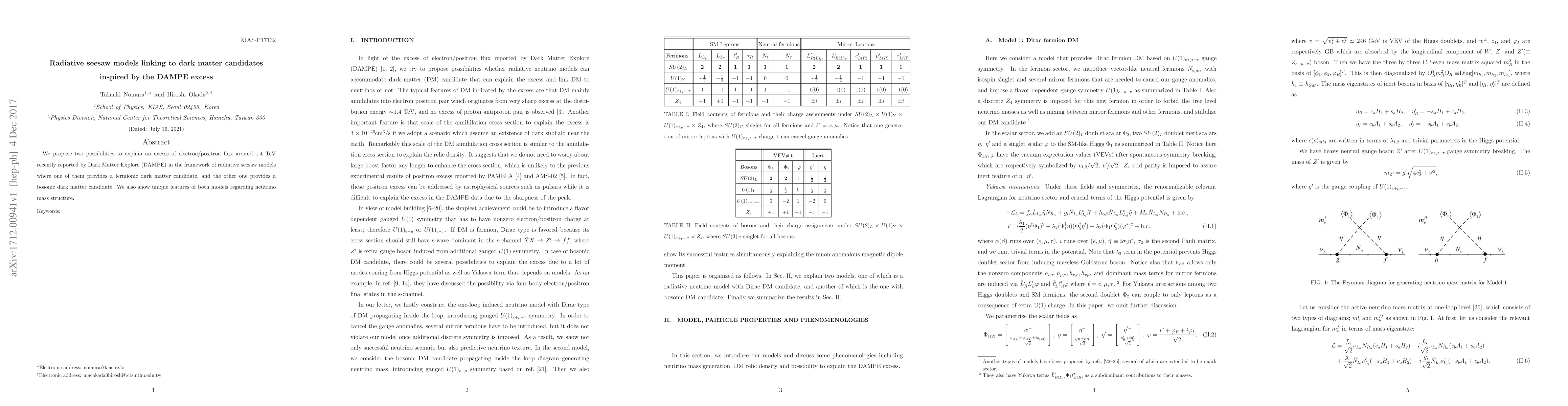 Summary: This paper explores two radiative seesaw models to explain the DAMPE excess of electron/positron flux around 1.4 TeV, proposing one with a fermionic dark matter candidate and the other with a bosonic one, while also discussing their unique neutrino mass structures.