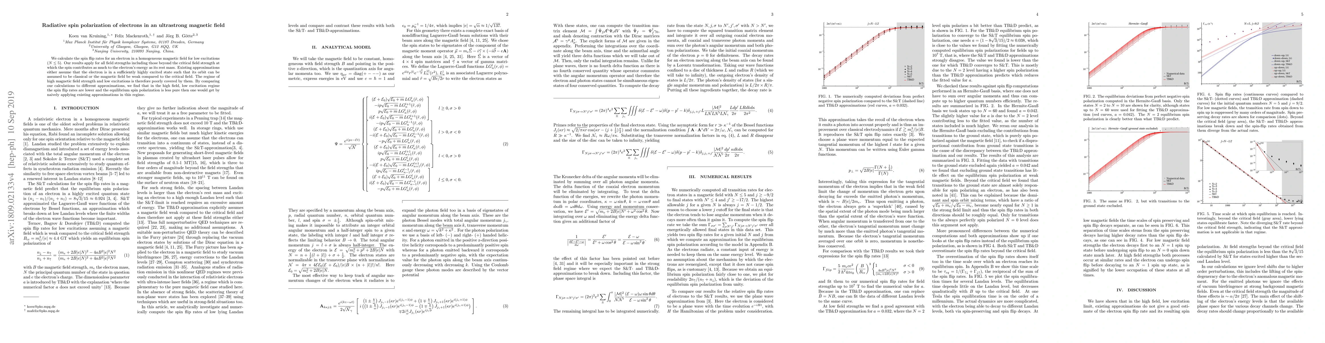We calculate the spin flip rates for an electron in a homogeneous magnetic field for low excitations ($N\le 5$). Our results apply for all field strengths including those beyond the critical field strength at which the spin contributes as much to the electron's energy as its rest mass. Existing approximations either assume that the electron is in a sufficiently highly excited state such that its orbit can be assumed to be classical or the magnetic field be weak compared to the critical field. The regime of high magnetic field strength and low excitations is therefore poorly covered by them. By comparing our calculations to different approximations, we find that in the high field, low excitation regime the spin flip rates are lower and the equilibrium spin polarization is less pure then one would get by naively applying existing approximations in this regime.