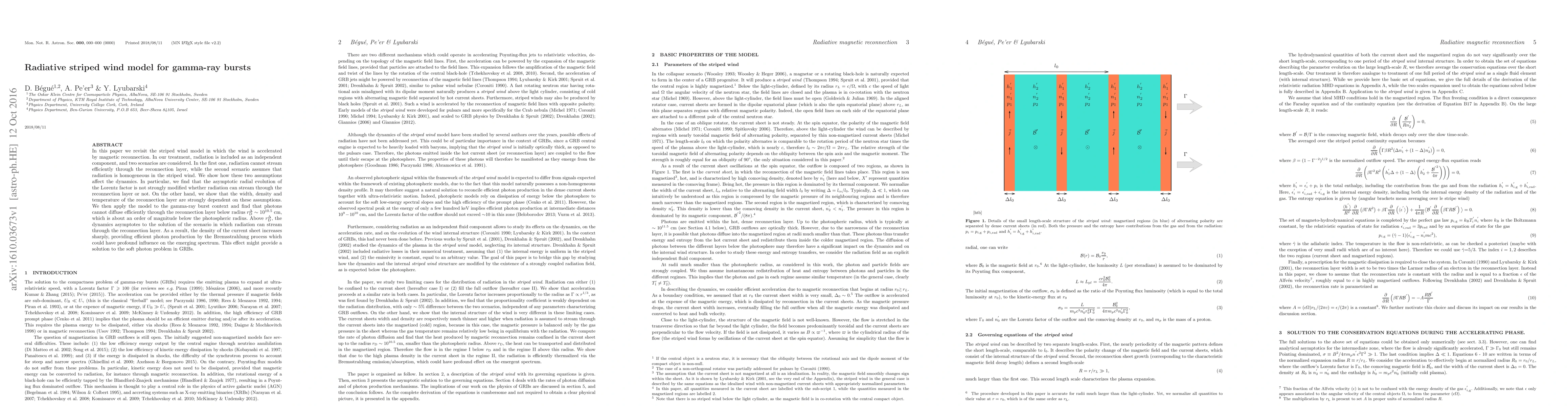 In this paper we revisit the striped wind model in which the wind is accelerated by magnetic reconnection. In our treatment, radiation is included as an independent component, and two scenarios are considered. In the first one, radiation cannot stream efficiently through the reconnection layer, while the second scenario assumes that radiation is homogeneous in the striped wind. We show how these two assumptions affect the dynamics. In particular, we find that the asymptotic radial evolution of the Lorentz factor is not strongly modified whether radiation can stream through the reconnection layer or not. On the other hand, we show that the width, density and temperature of the reconnection layer are strongly dependent on these assumptions. We then apply the model to the gamma-ray burst context and find that photons cannot diffuse efficiently through the reconnection layer below radius $r_{\rm D}^{\Delta} \sim 10^{10.5}$ cm, which is about an order of magnitude below the photospheric radius. Above $r_{\rm D}^{\Delta}$, the dynamics asymptotes to the solution of the scenario in which radiation can stream through the reconnection layer. As a result, the density of the current sheet increases sharply, providing efficient photon production by the Bremsstrahlung process which could have profound influence on the emerging spectrum. This effect might provide a solution to the soft photon problem in GRBs.