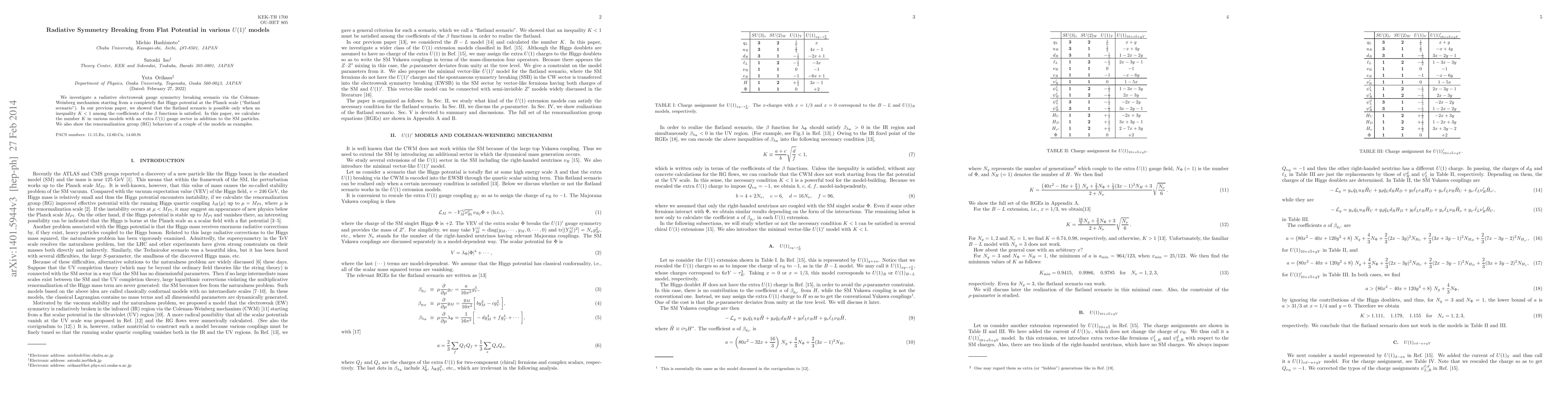 This paper explores radiative electroweak symmetry breaking through the Coleman-Weinberg mechanism from a flat Higgs potential at the Planck scale, examining various U(1)' models with extra gauge sectors. It calculates the parameter K in these models and analyzes their renormalization group behaviors.