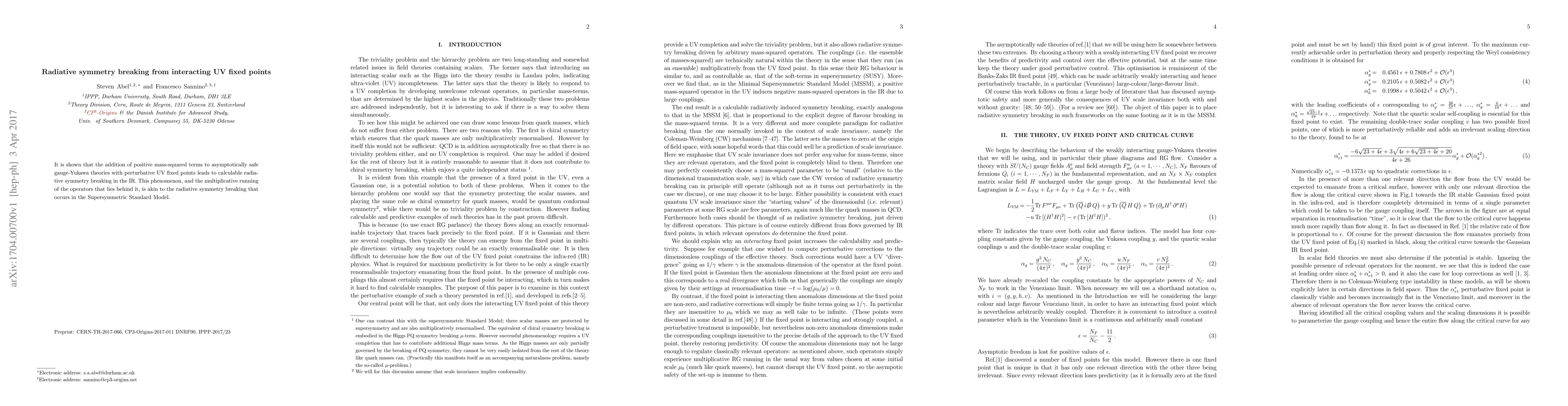 The paper demonstrates that adding positive mass-squared terms to asymptotically safe gauge-Yukawa theories with perturbative UV fixed points results in calculable radiative symmetry breaking in the IR. This process resembles radiative symmetry breaking in the Supersymmetric Standard Model.