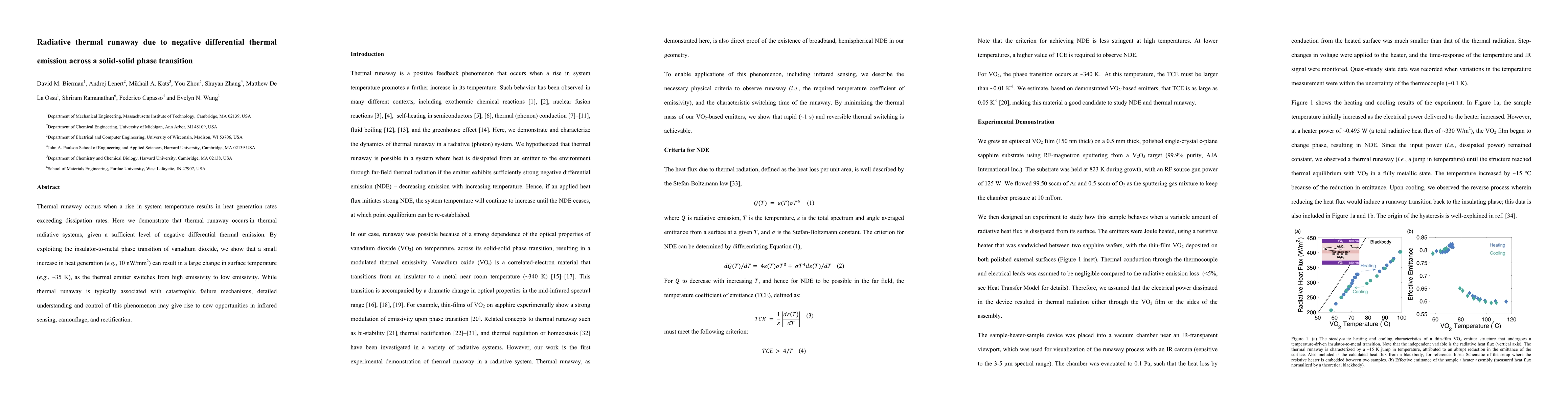 This paper investigates radiative thermal runaway caused by negative differential thermal emission during a solid-solid phase transition, specifically in vanadium dioxide. It demonstrates that a small increase in heat generation can lead to significant temperature changes due to the material's transition from high to low emissivity, potentially enabling novel applications in infrared sensing and camouflage.