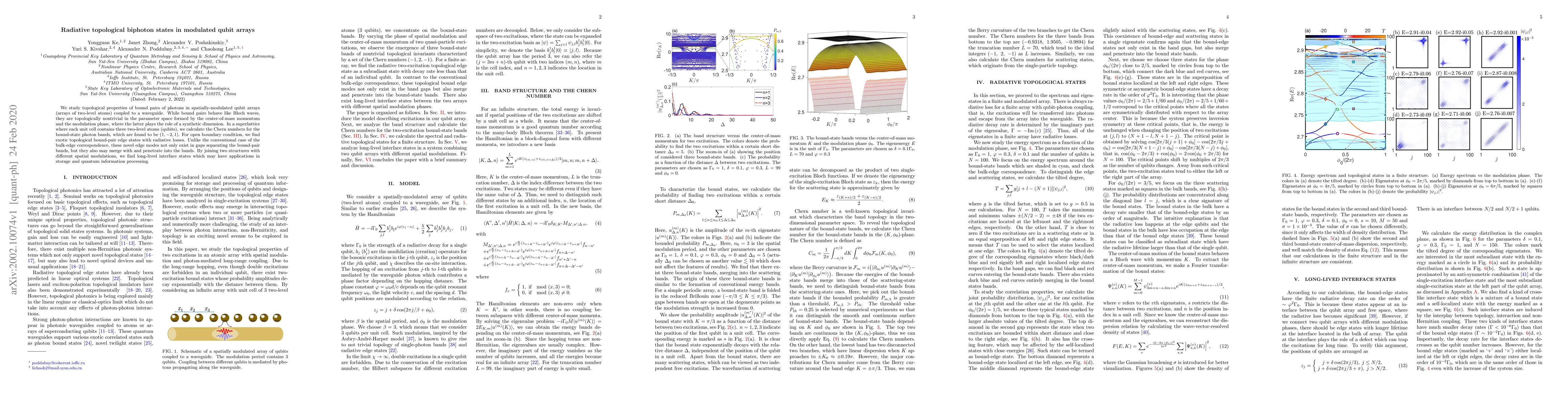 We study topological properties of bound pairs of photons in spatially-modulated qubit arrays (arrays of two-level atoms) coupled to a waveguide. While bound pairs behave like Bloch waves, they are topologically nontrivial in the parameter space formed by the center-of-mass momentum and the modulation phase, where the latter plays the role of a synthetic dimension. In a superlattice where each unit cell contains three two-level atoms (qubits), we calculate the Chern numbers for the bound-state photon bands, which are found to be $(1,-2,1)$. For open boundary condition, we find exotic topological bound-pair edge states with radiative losses. Unlike the conventional case of the bulk-edge correspondence, these novel edge modes not only exist in gaps separating the bound-pair bands, but they also may merge with and penetrate into the bands. By joining two structures with different spatial modulations, we find long-lived interface states which may have applications in storage and quantum information processing.