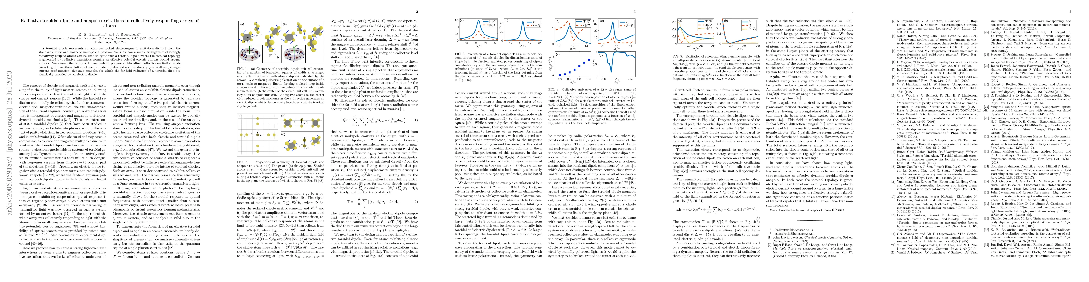 This paper explores the synthesis of toroidal dipole and anapole excitations in arrays of strongly radiatively coupled atoms, demonstrating how collective atomic responses can generate toroidal electromagnetic fields and dynamic anapole modes that cancel far-field radiation.
