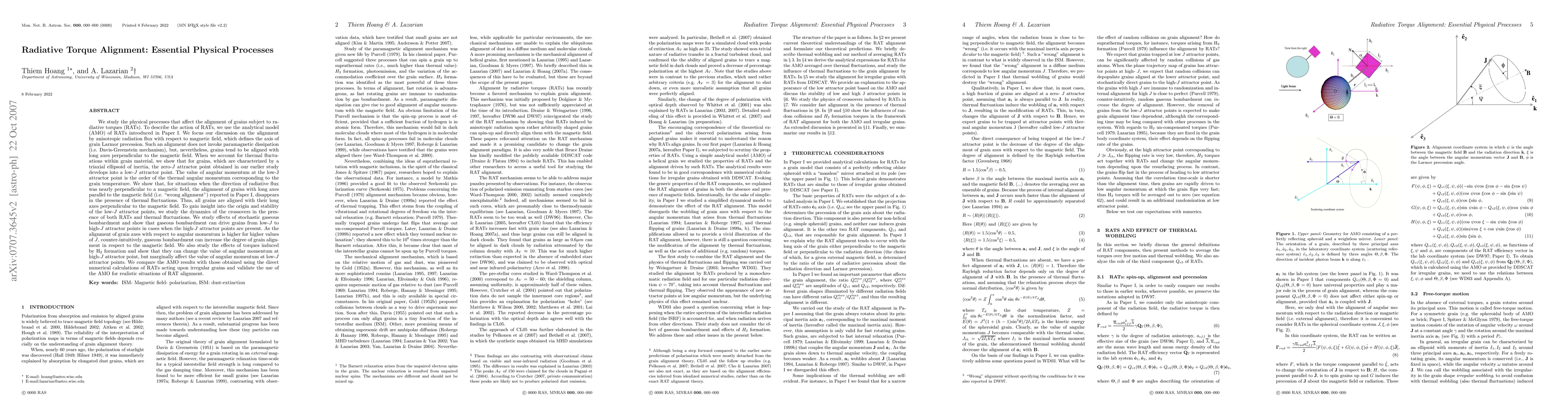 We study the physical processes that affect the alignment of grains subject to radiative torques (RATs). To describe the action of RATs, we use the analytical model (AMO) of RATs introduced in Paper I. We focus our discussion on the alignment by anisotropic radiation flux with respect to magnetic field, which defines the axis of grain Larmor precession. Such an alignment does not invoke paramagnetic dissipation (i.e. Davis-Greenstein mechanism), but, nevertheless, grains tend to be aligned with long axes perpendicular to the magnetic field. When we account for thermal fluctuations within grain material, we show that for grains, which are characterized by a triaxial ellipsoid of inertia, the zero-$J$ attractor point obtained in our earlier study develops into a low-$J$ attractor point. We study effects of stochastic gaseous bombardment and show that gaseous bombardment can drive grains from low-$J$ to high-$J$ attractor points in cases when the high-$J$ attractor points are present. As the alignment of grain axes with respect to angular momentum is higher for higher values of $J$, counter-intuitively, gaseous bombardment can increase the degree of grain alignment in respect to the magnetic field. We also study the effects of torques induced by H$_2$ formation and show that they can change the value of angular momentum at high-$J$ attractor point, but marginally affect the value of angular momentum at low-$J$ attractor points. We compare the AMO results with those obtained using the direct numerical calculations of RATs acting upon irregular grains and validate the use of the AMO for realistic situations of RAT alignment.