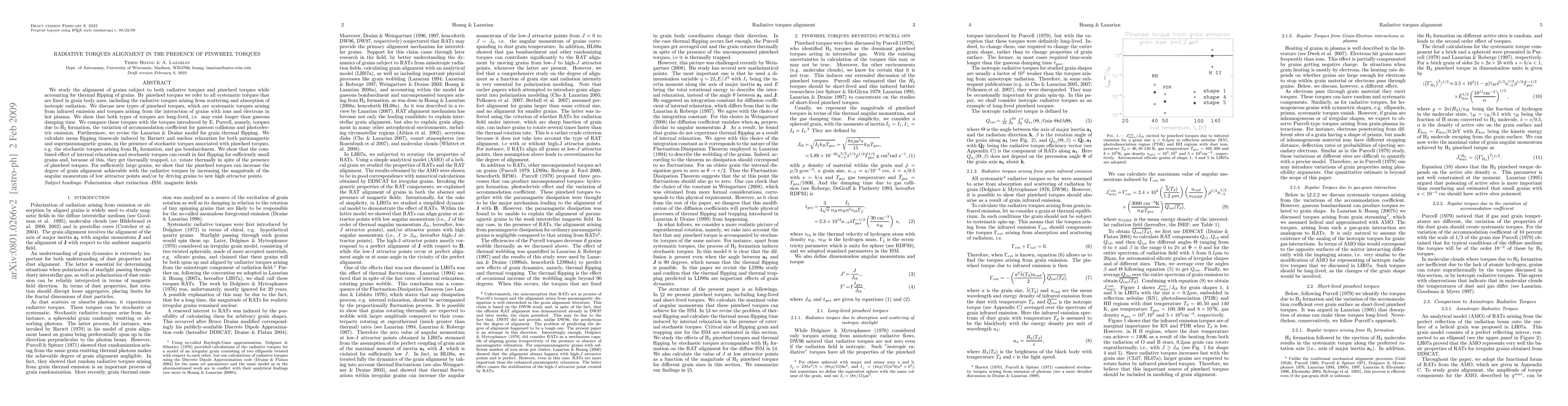 We study the alignment of grains subject to both radiative torques and pinwheel torques while accounting for thermal flipping of grains. By pinwheel torques we refer to all systematic torques that are fixed in grain body axes, including the radiative torques arising from scattering and absorption of isotropic radiation. We discuss new types of pinwheel torques, which are systematic torques arising from infrared emission and torques arising from the interaction of grains with ions and electrons in hot plasma. We show that both types of torques are long-lived, i.e. may exist longer than gaseous damping time. We compare these torques with the torques introduced by E. Purcell, namely, torques due to H$_2$ formation, the variation of accommodation coefficient for gaseous collisions and photoelectric emission. Furthermore, we revise the Lazarian & Draine model for grain thermal flipping. We calculate mean flipping timescale induced by Barnett and nuclear relaxation for both paramagnetic and superparamagnetic grains, in the presence of stochastic torques associated with pinwheel torques, e.g. the stochastic torques arising from H$_2$ formation, and gas bombardment. We show that the combined effect of internal relaxation and stochastic torques can result in fast flipping for sufficiently small grains and, because of this, they get thermally trapped, i.e. rotate thermally in spite of the presence of pinwheel torques. For sufficiently large grains, we show that the pinwheel torques can increase the degree of grain alignment achievable with the radiative torques by increasing the magnitude of the angular momentum of low attractor points and/or by driving grains to new high attractor points.