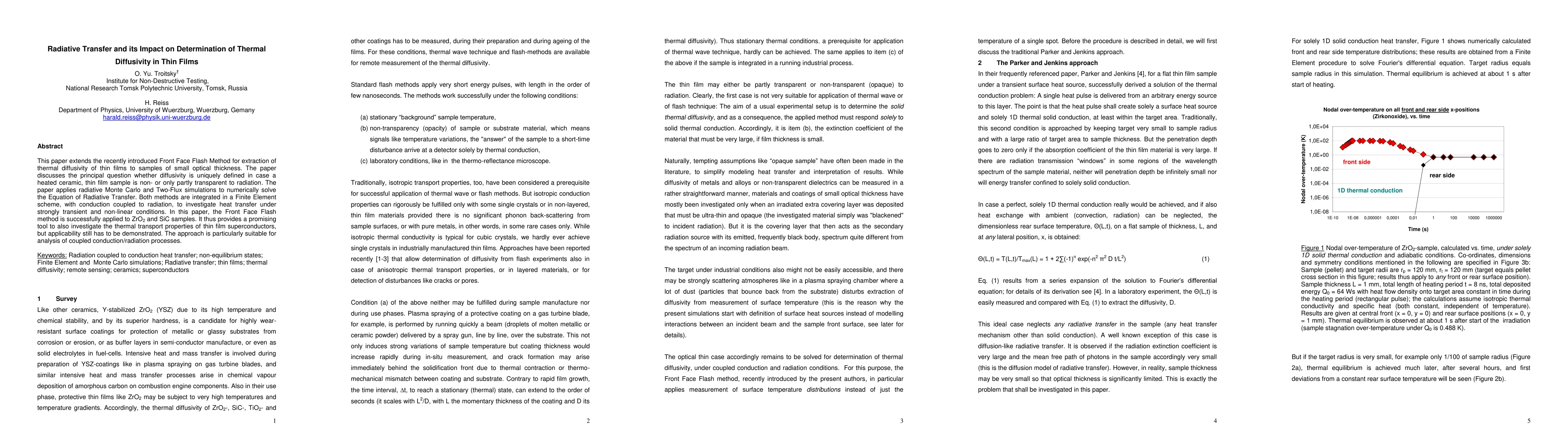 This paper explores the Front Face Flash Method for determining thermal diffusivity in thin films, applying radiative Monte Carlo and Two-Flux simulations to solve the Equation of Radiative Transfer. The method successfully analyzes ZrO2- and SiC samples, indicating potential for studying thin film superconductors, though further validation is needed.