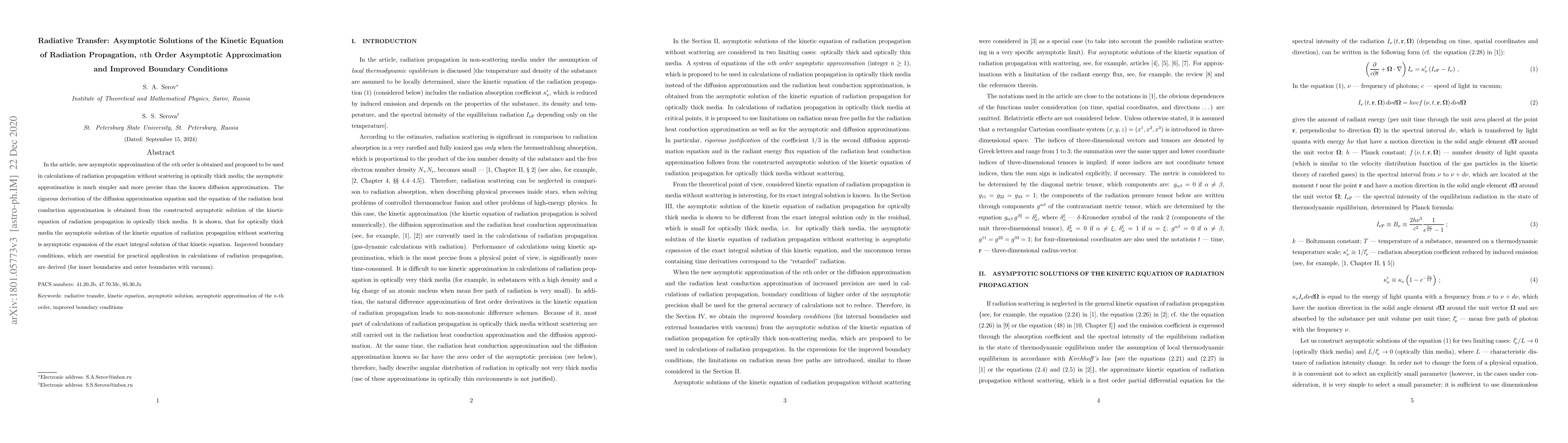 In the article, new asymptotic approximation of the $n$th order is obtained and proposed to be used in calculations of radiation propagation without scattering in optically thick media; the asymptotic approximation is much simpler and more precise than the known diffusion approximation. The rigorous derivation of the diffusion approximation equation and the equation of the radiation heat conduction approximation is obtained from the constructed asymptotic solution of the kinetic equation of radiation propagation in optically thick media. It is shown, that for optically thick media the asymptotic solution of the kinetic equation of radiation propagation without scattering is asymptotic expansion of the exact integral solution of that kinetic equation. Improved boundary conditions, which are essential for practical application in calculations of radiation propagation, are derived (for inner boundaries and outer boundaries with vacuum).
