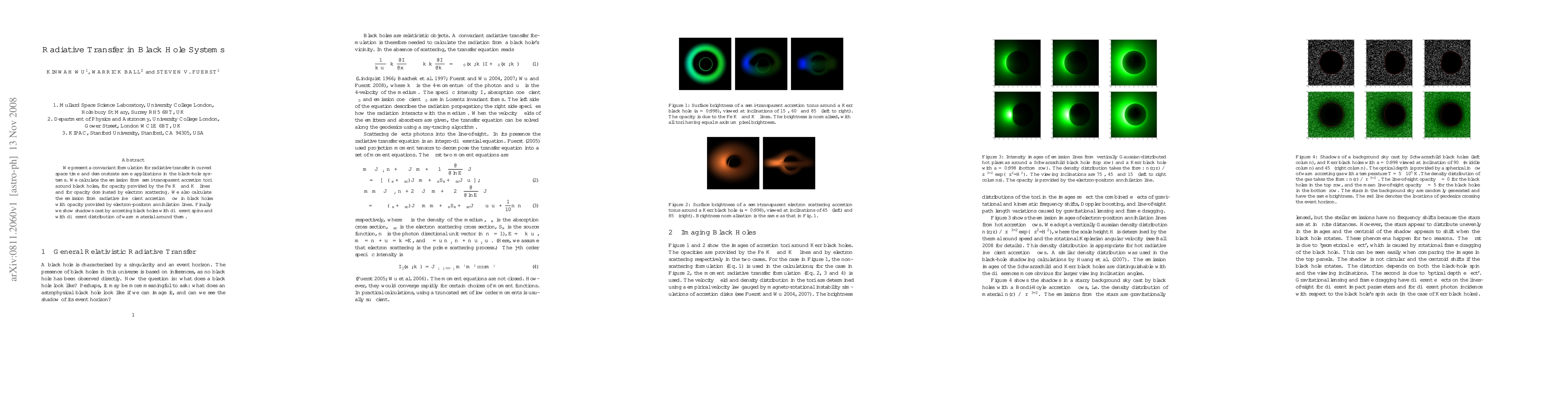 We present a convariant formulation for radiative transfer in curved space time and demonstrate some applications in the black-hole systems. We calculate the emission from semi-transparent accretion tori around black holes, for opacity provided by the Fe K lines and for opacity dominated by electron scattering. We also calculate the emission from radiative inefficient accretion flow in black holes with opacity provided by electron-positron annihilation lines. Finally we show shadows cast by accreting black holes with different spins and with different distribution of warm material around them.